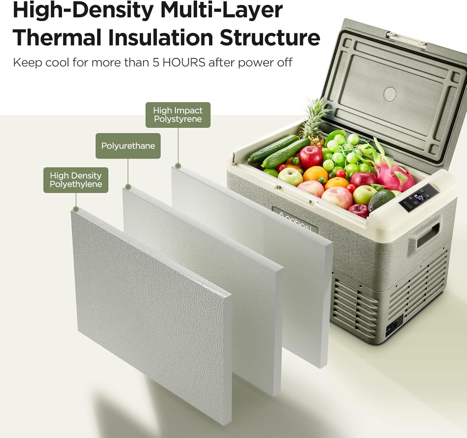 - 【Fast Cooling And Smart APP Control】AAOBOSI 12 volt refrigerator uses a state-of-the-art compressor with advanced 3D refrigeration technology for rapid cooling from68 ° F to 32 ° F in just 15 minutes. It can be used as both a freezer or a refrigerator, no ice is needed. With the companion smartphone application, you can easily remote control and monitor the operation status of the cooler fridge. You can adjust temperature settings, monitor battery level, view running time.