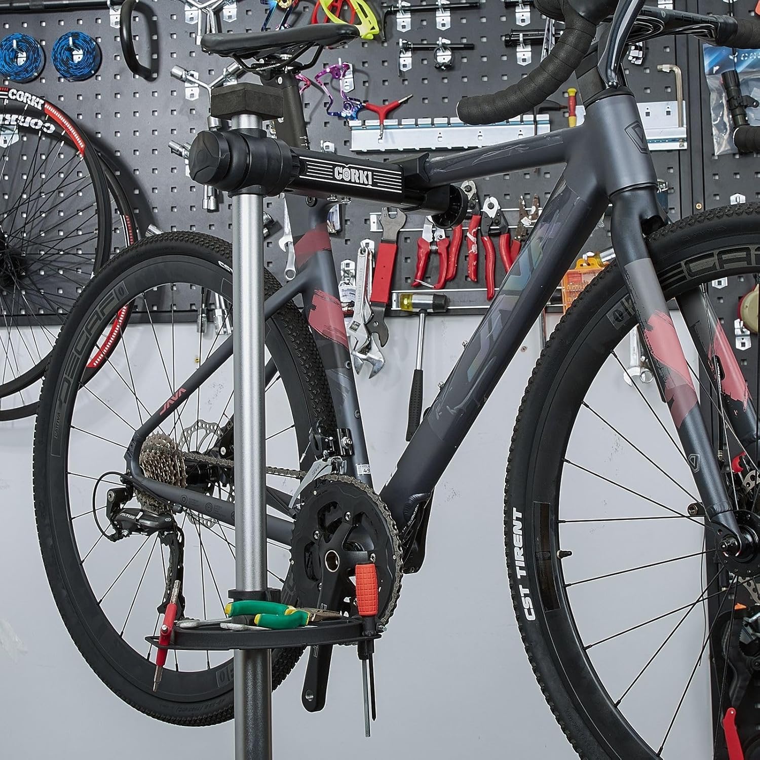 - ššš«š¬ššš¢š„š - A versatile maintenance bike stand that is compatible with a range of bike styles and sizes is a valuable asset for any cyclist. Clamp and support your carbon fiber gravel bike or your downhill racing steed. Load the bike stand with your bike weighing up to 38kg. Use the Corki Cycles bike maintenance stand for all your bike's basic maintenance or even a full upgrade/overhaul. Our maintenance bike stand will last for years to come.