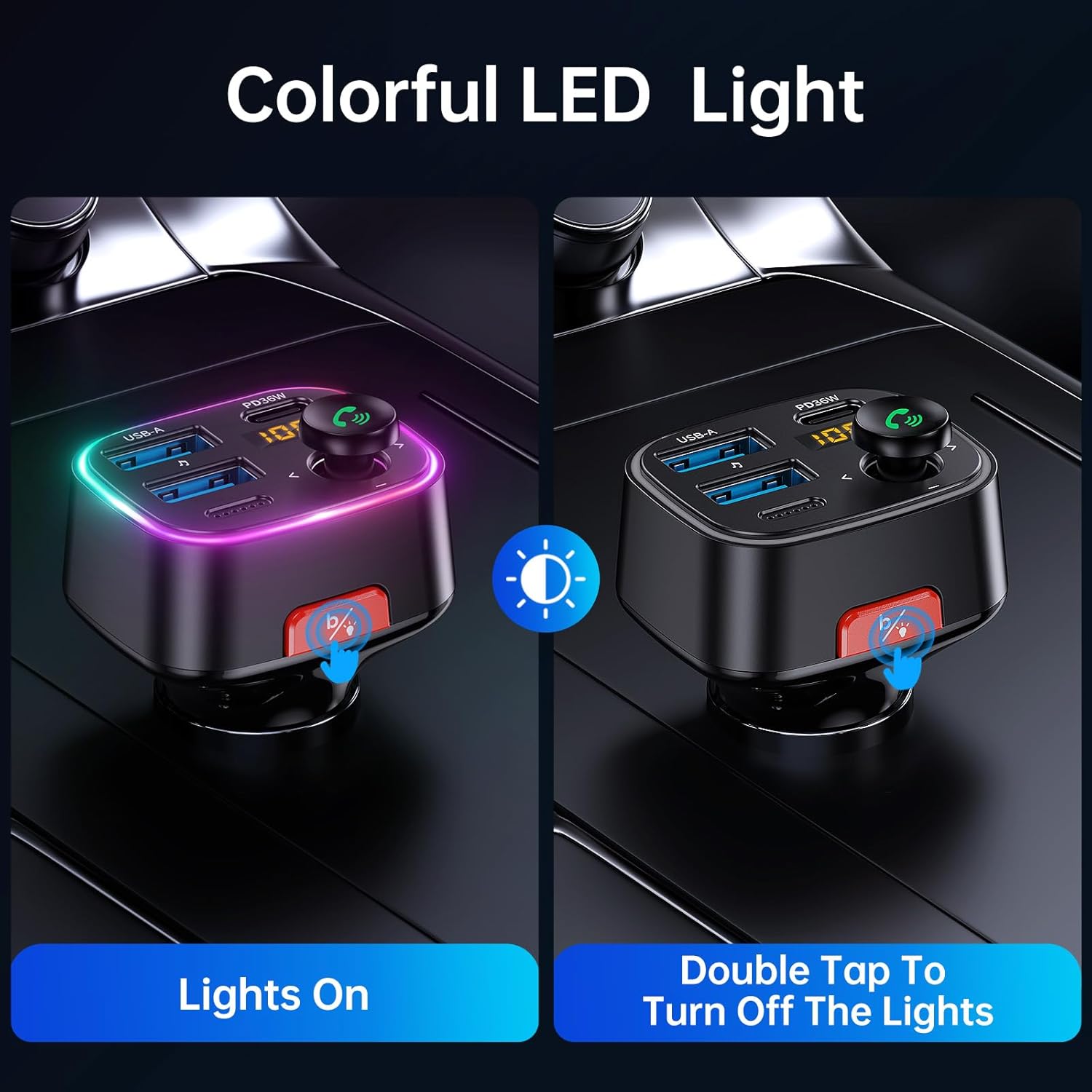 Syncwire Bluetooth 5.4 FM Transmitter Car Adapter 48W (PD 36W & 12W) [Light Switch] [HiFi Bass Sound] [Fast Charging] Wireless Radio Music Adapter LED Display Hands-Free Calling Support USB Drive