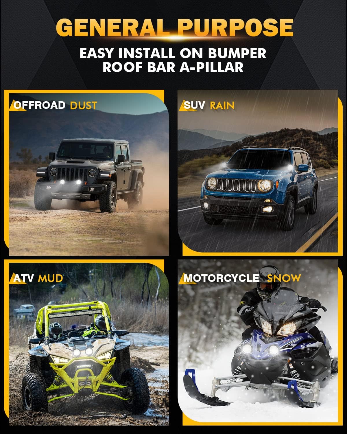 - [50,000+ HOURS LIFESPAN DURABILITY] - Led off road lights are made of thickened 6063 diecasting aluminum heat sinks, which maximizes surface area for optimal cooling and enhances the led pod lights' lifespan to over 50,000 hours. 90° adjustable stainless steel mounting brackets make it easy to change your lighting direction.