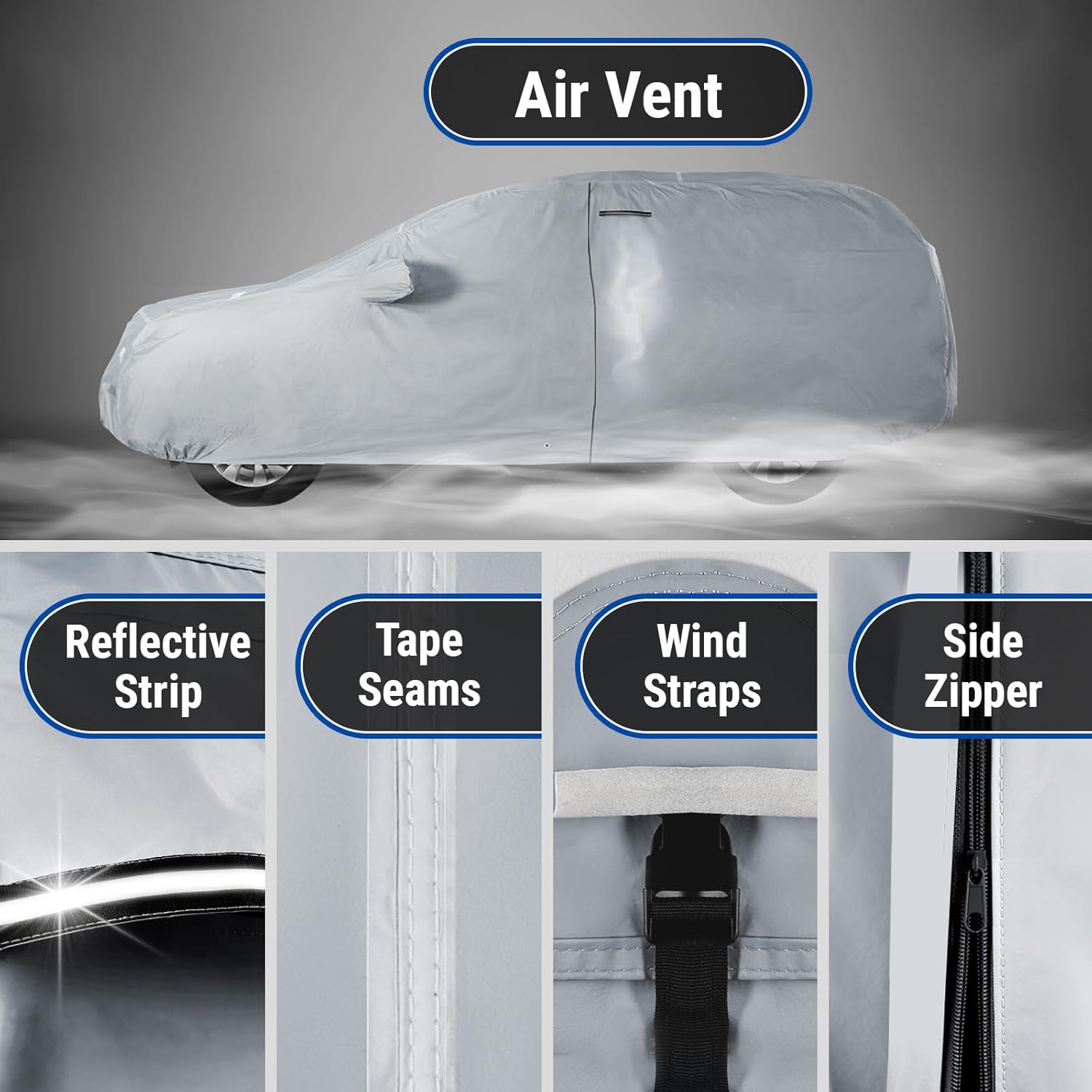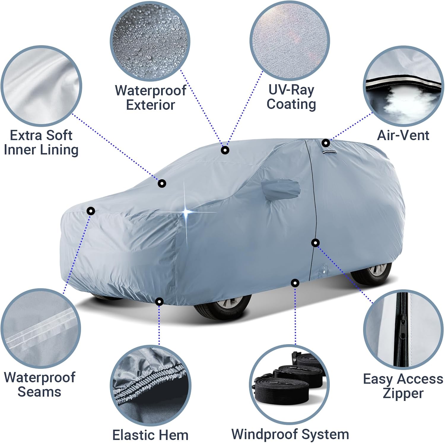 - ADVANCED FEATURES FOR SUPERIOR PROTECTION: Our cover is built to last, with waterproof seams to prevent leaks and ventilation for airflow, keeping your car dry. The strong, multilayered material offers durable, long-lasting protection in any weather.