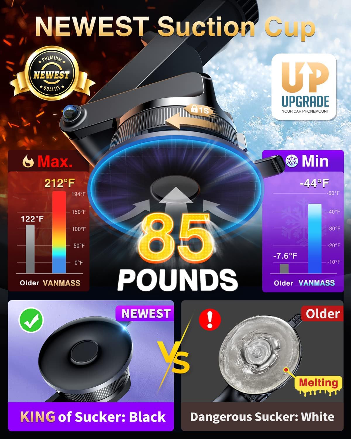 - ăNewest Rotary Mighty Suction Cup: Strongest SuctionăMade of German materials, exclusive formula, one-piece molding rotary suction cup technology to ensure no melting or marks, UV and direct sun exposure resistance, -40~194â,resistance. Maximize the adhesion of the suction cups to ensure the best results: 85LB Suction - 50% higher than the traditional. Based on 30,000+ times of 42-step procedure high precision tests, the rotary suction cup is superior to traditional press-on suction cup.