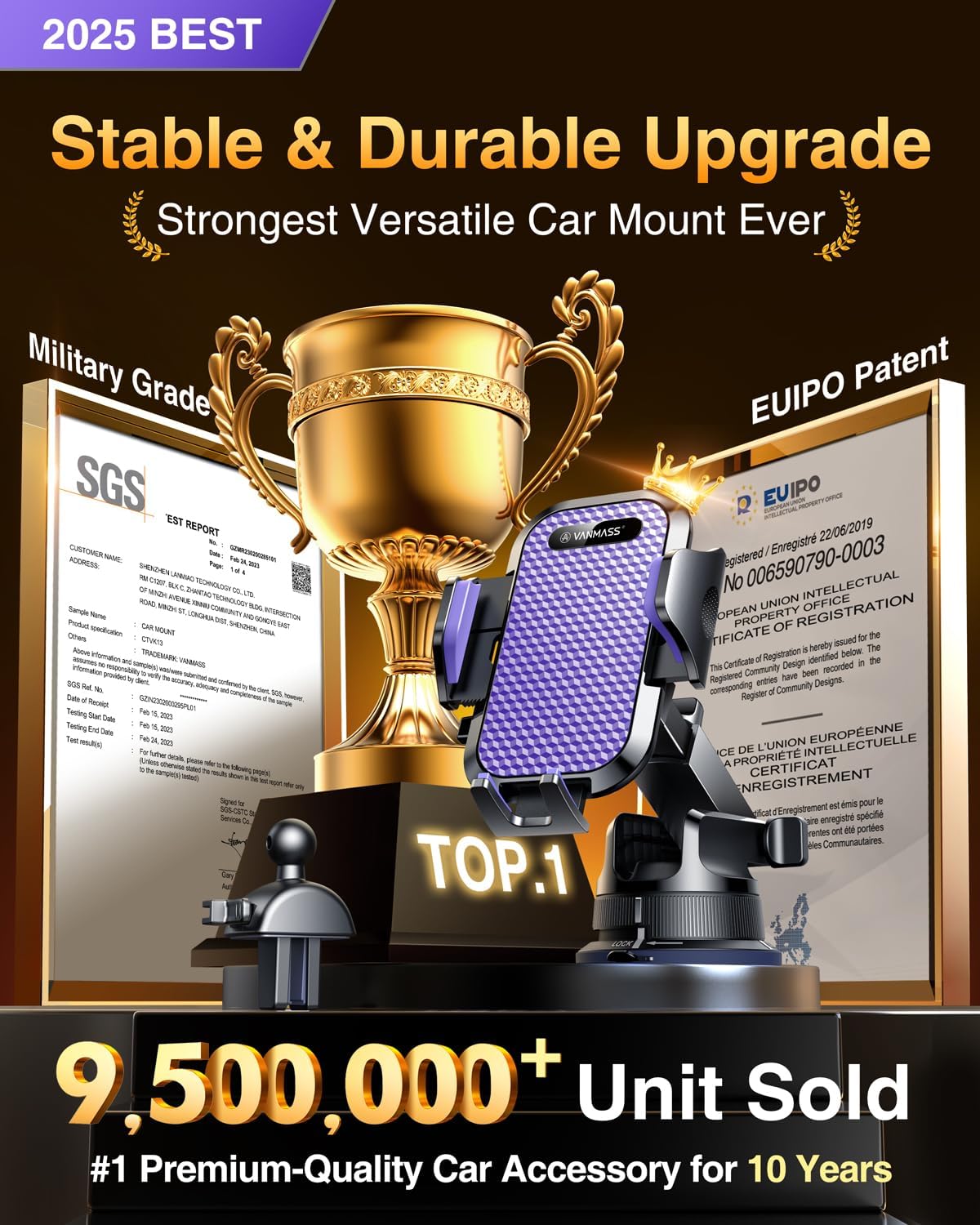 - ăPro VersionďźVANMASS's Best ChoiceăVANMASS has been dedicated to car phone holder for 8 years, always leading the car holder industry in all aspects: safety, stability, durability, compatibility, multi-scene adaptability,climate friendly. The pro version mount enables the cutting-edge design team to create the best choice for customers- highest rating, most customers' preference, EU Intellectual Property Patent (No.007708805-0001), Military Grade Cert (No.GZMR220601855501), CP65/REACH/ROHS