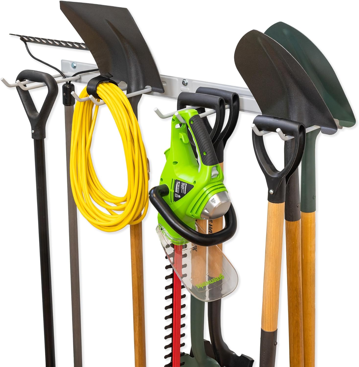 - RECLAIM YOUR GARAGE – Conquer clutter with this garden tool organizer designed for garage storage, sheds, or workshops. Measuring 36" L x 9.5" W x 2.5" H, it features four PVC-coated garage hooks and a 250 lb weight capacity, ideal for storing shovels, brooms, rakes, and power tools. Installs with 3 heavy-duty lag screws directly into 16" wall studs for secure, long-lasting support.