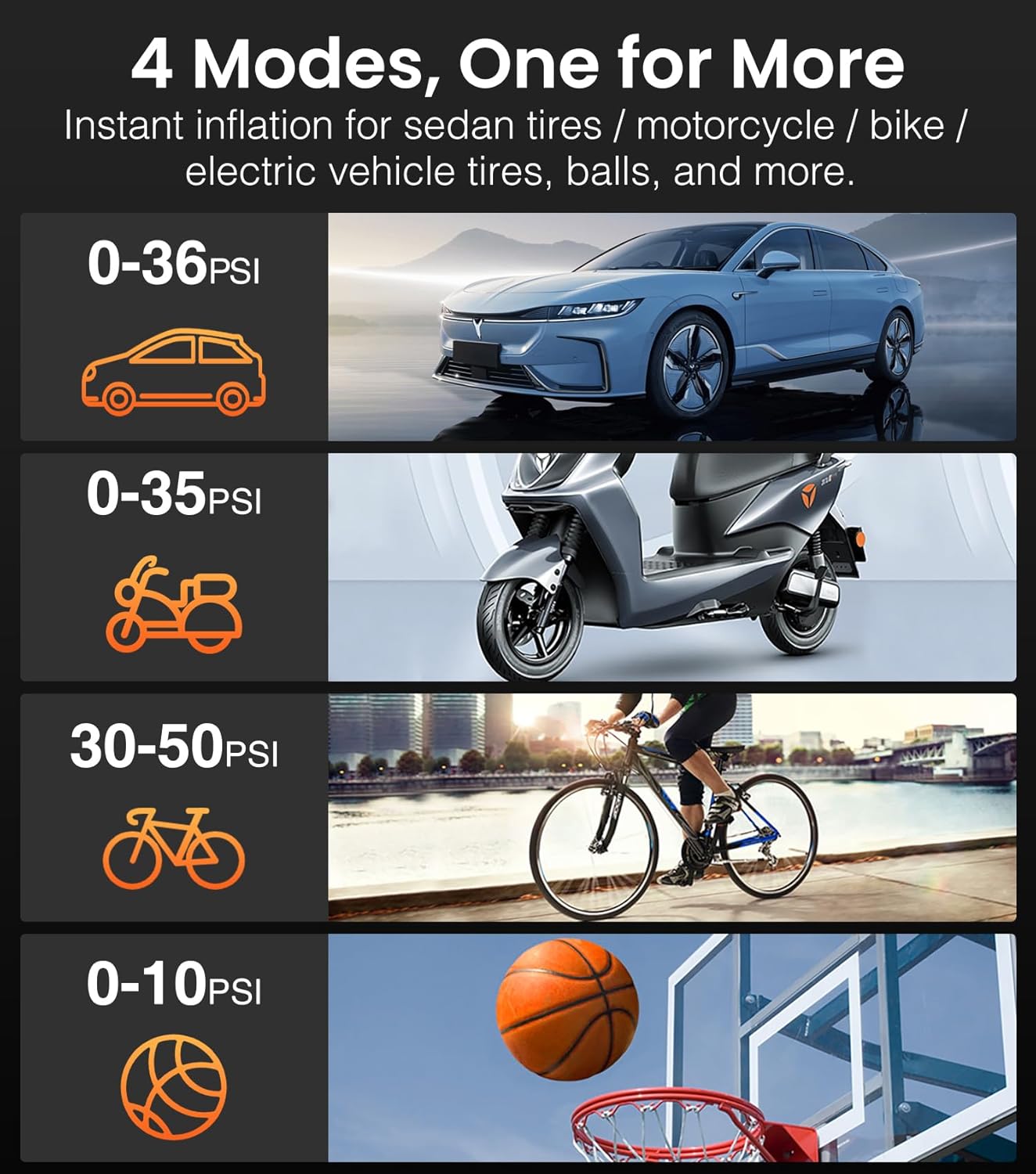 - 【Dual display & 4+N Smart Modes】PECHAM Portable air tire inflator have high-definition large LCD dual display shows real-time and preset pressure value, which can also be used as a digital pressure gauge with 4 pressure unit options- PSI, KPA, BAR, KG/CM. 4 types of preset modes (bicycle, motorcycle, car, and ball) are convenient for beginners to use. The custom mode allows you to set the pressure value (3-160psi) according to the inflation object