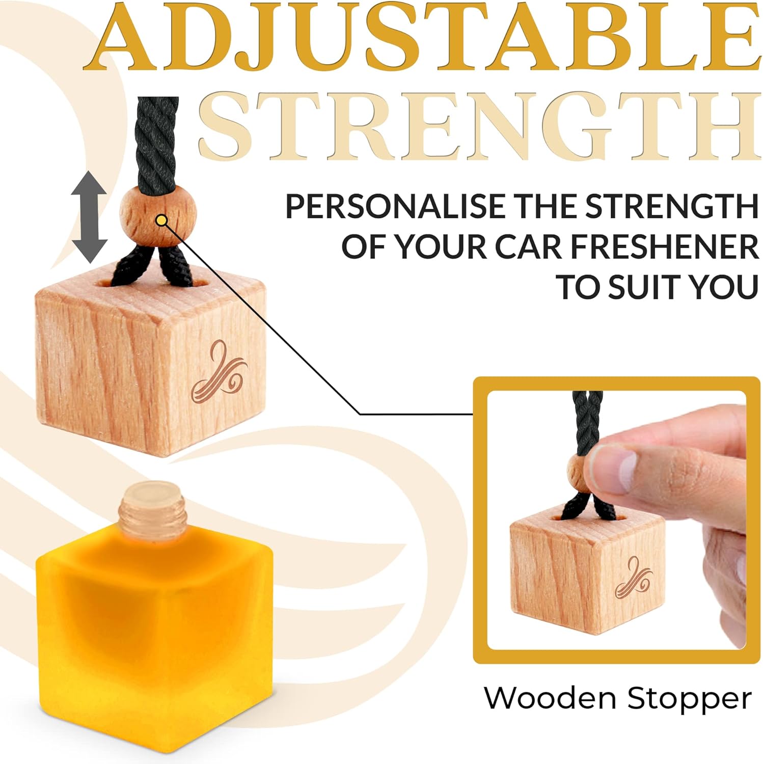 - ADJUST THE STRENGTH TO SUIT YOU - Personalise your car smell air freshener to suit your taste. Simply move the wooden stopper up and down the diffuser chords to set the strength to your liking.