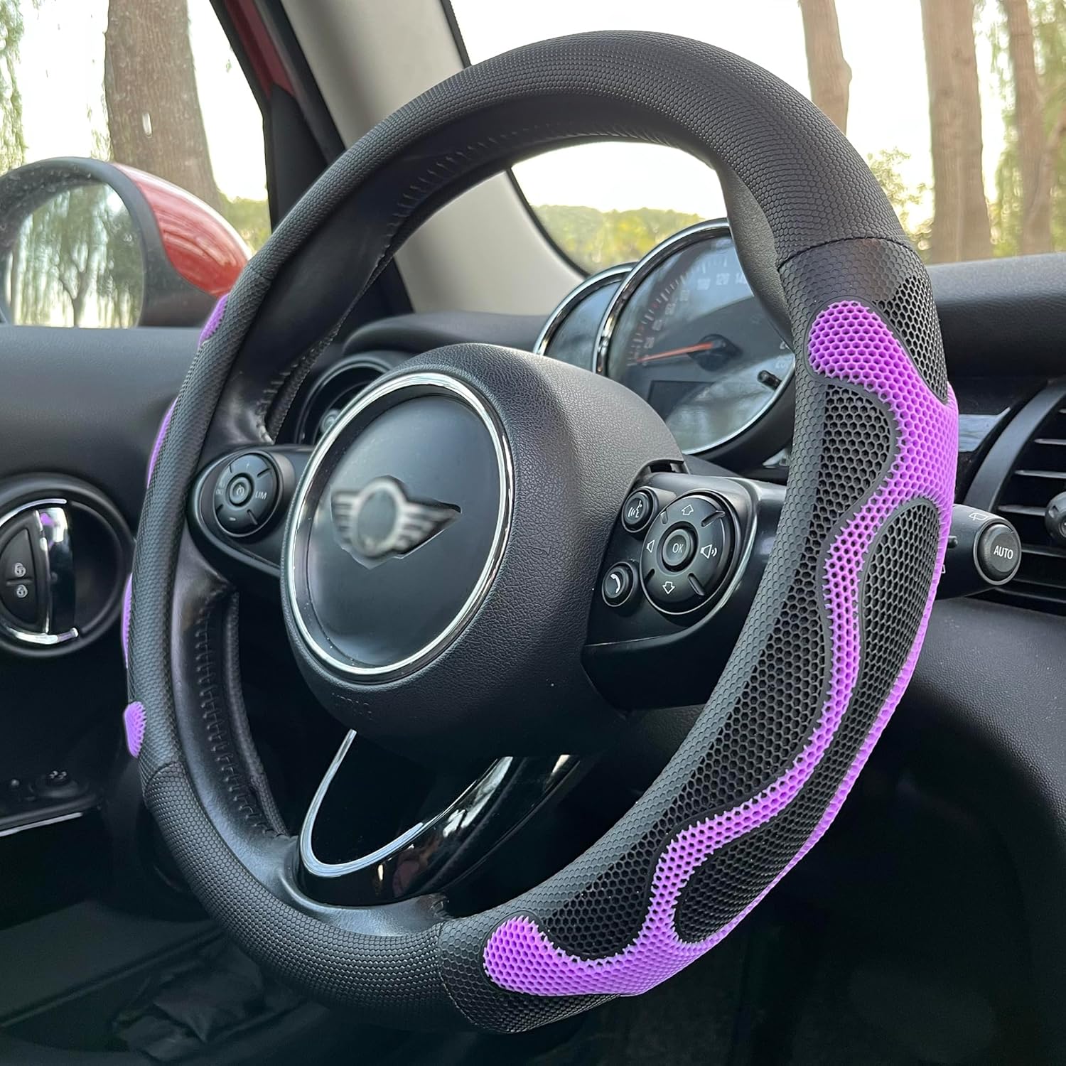 - Built to Last: Crafted with a solid rubber inner circle, textured microleather leather, and a 3D honeycomb silicone grip, this cover boasts a unique material combination that ensures exceptional durability. The silicone grip effectively relieving sweaty hands under hot weather. Enjoy a long-lasting and comfortable grip with PINCTROT car steering wheel cover.