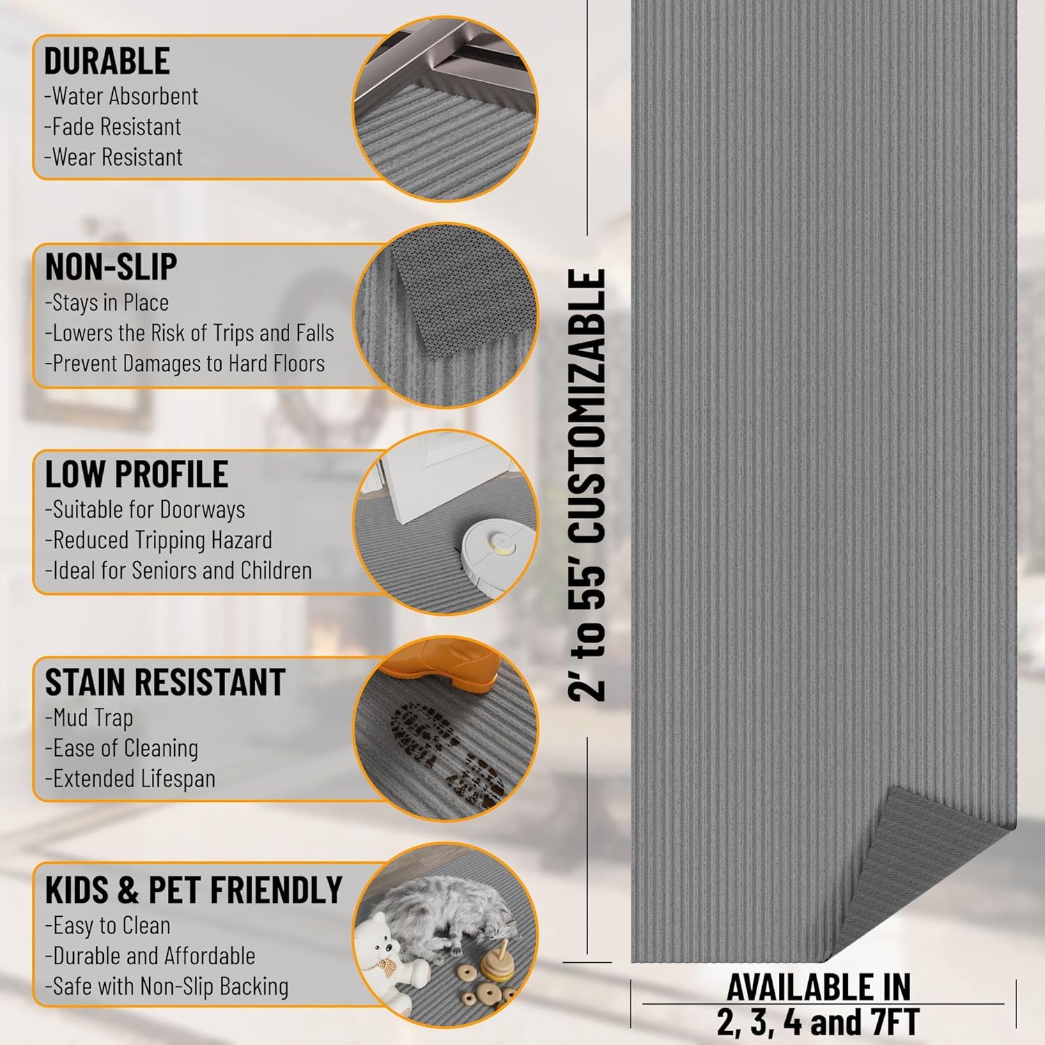 - [CUSTOMIZABLE]: These rugs are easy to cut into any size to fit your exact measurements. Cut them to your desired size and add the finishing touches to your hallway, entryway, garage, office, living room, patio, deck, finished basement, and laundry room.