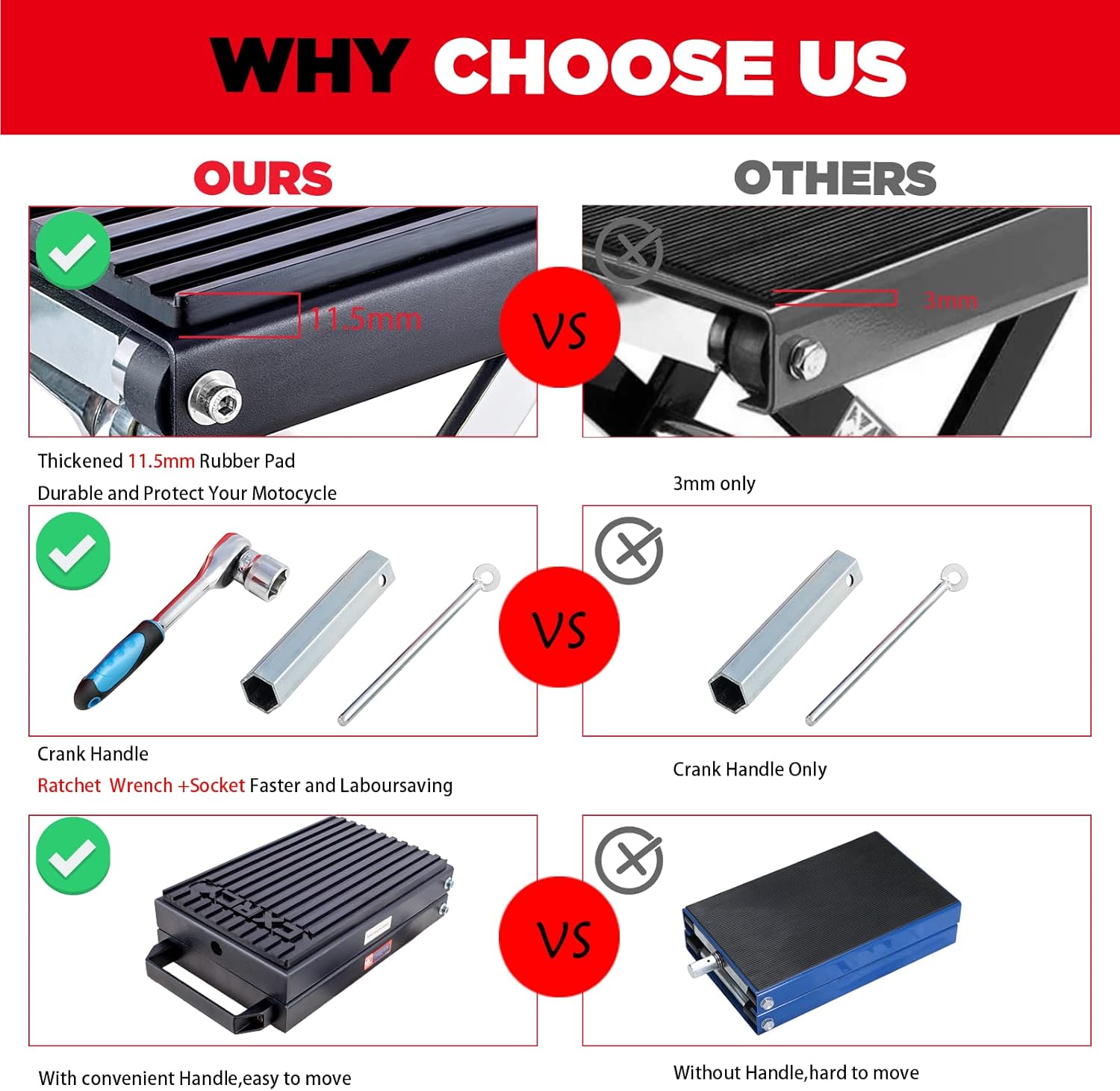 - Equipped with Ratchet Wrench&Handy Handle : In addition to the crank handle,we also have an extra ratchet wrench,which is easier to use than crank handle,you will spend less effort to lift the motorcycle up quickly.Besides, the convenient handle makes it easier to move the jack