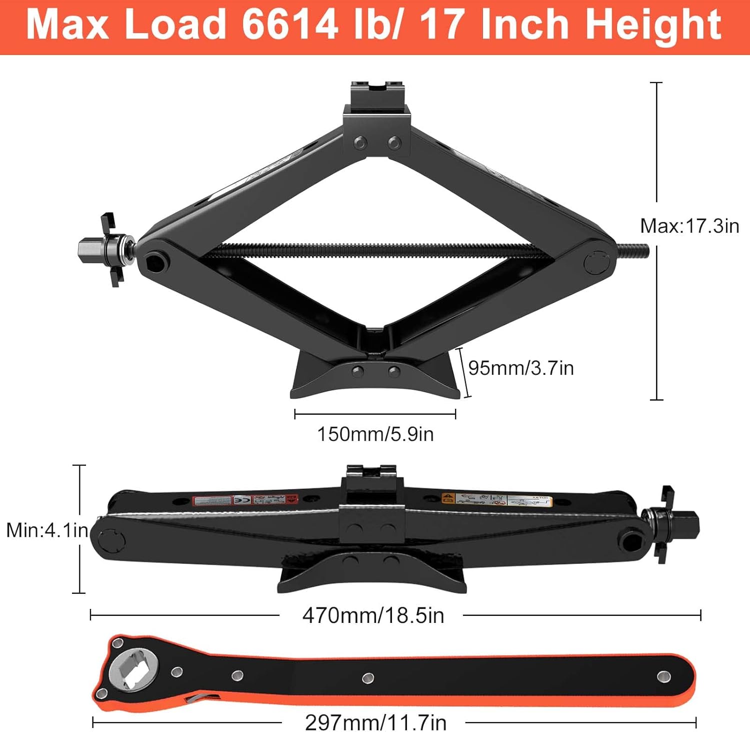 - 【 High Capacity Jack 】 Maximum lifting 6,614 lb (3.0 Ton) , 17.3 inches Height. operating distance from 4.13 inches to 17.3 inches. Jack Net weight 7.3 lbs (3.3kg).