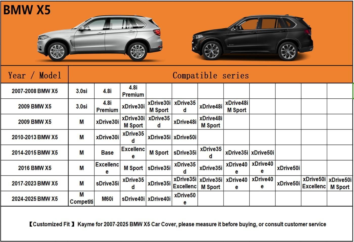 - ăSuitable forăâ Custom fit for BMW X5 (2007-2025). Come with a large enough portable bag to store your cover when you do not use
