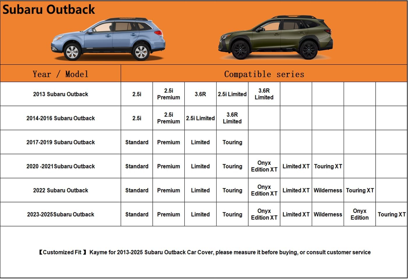 - ăSuitable forăâ Custom fit for Subaru Outback (1994-2025). Come with a large enough portable bag to store your cover when you do not use