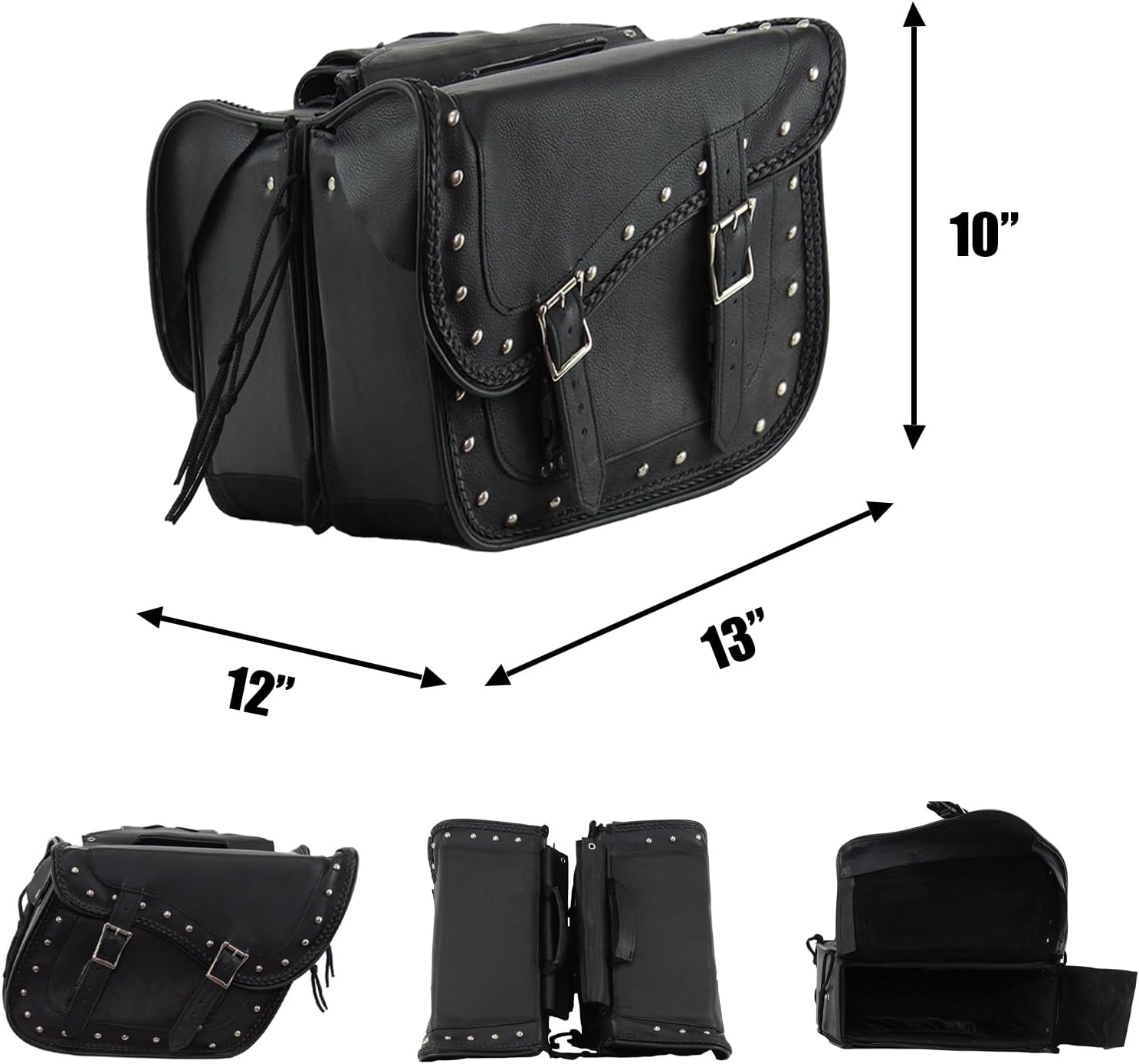 Synthetic Leather Motorcycle Luggage Bag - Waterproof Throw Over Saddlebags For Motorcycles - Softails, Sportsters, Choppers, Dyna, V-star, Shadow (With Studs, Black, 13'x13'x10')