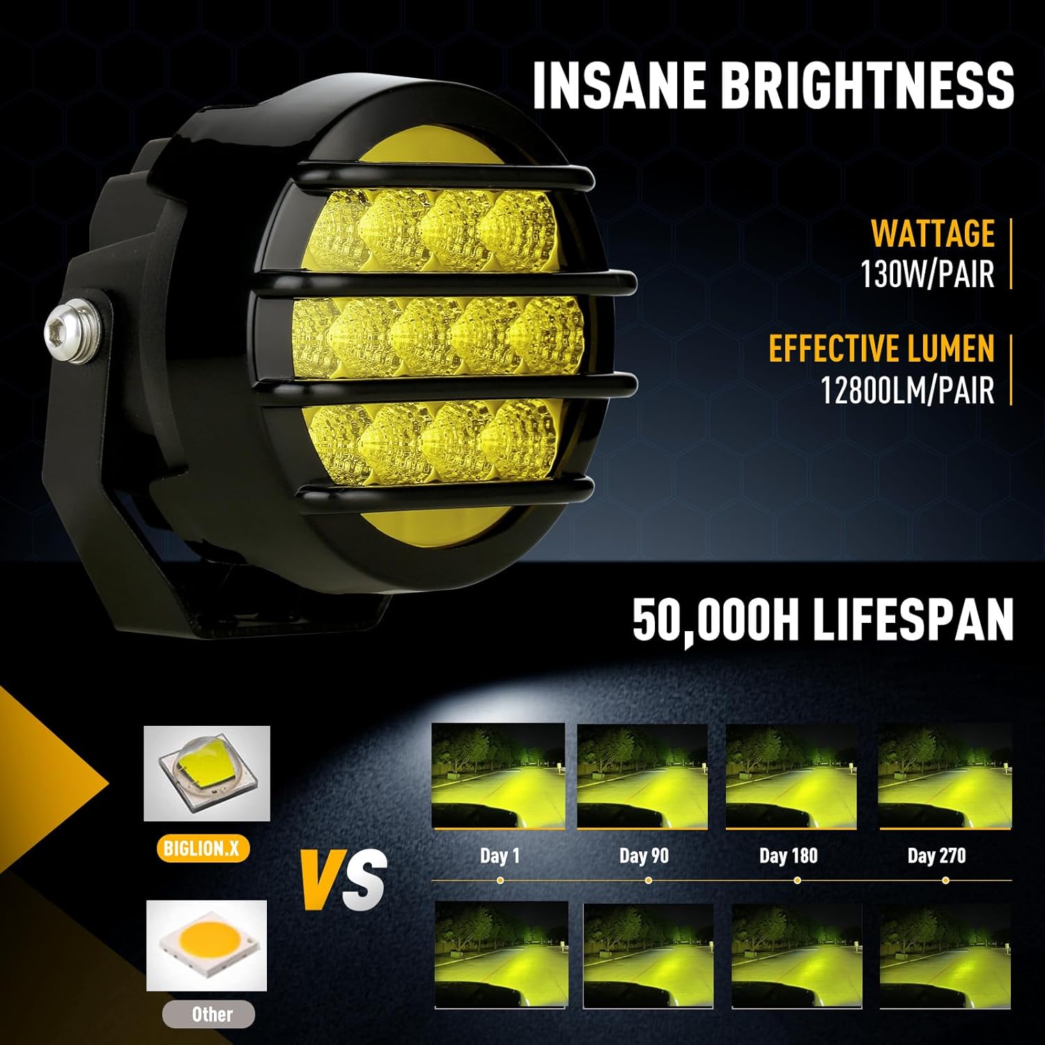 - 【HIGH STANDARD WATERPROOF GRADE】Amber fog lights conform to IP68 and IP69K standard. 4 inch led pods applied military breather design to prevent condensation and fogging. Lengthen biglion.x 4 inch life. Balance light bar’s differential pressure to achieve thermal balance is attained. Let the sealed lamp beads have better heat dissipation. Enhance the usage of reliability in extreme environment.