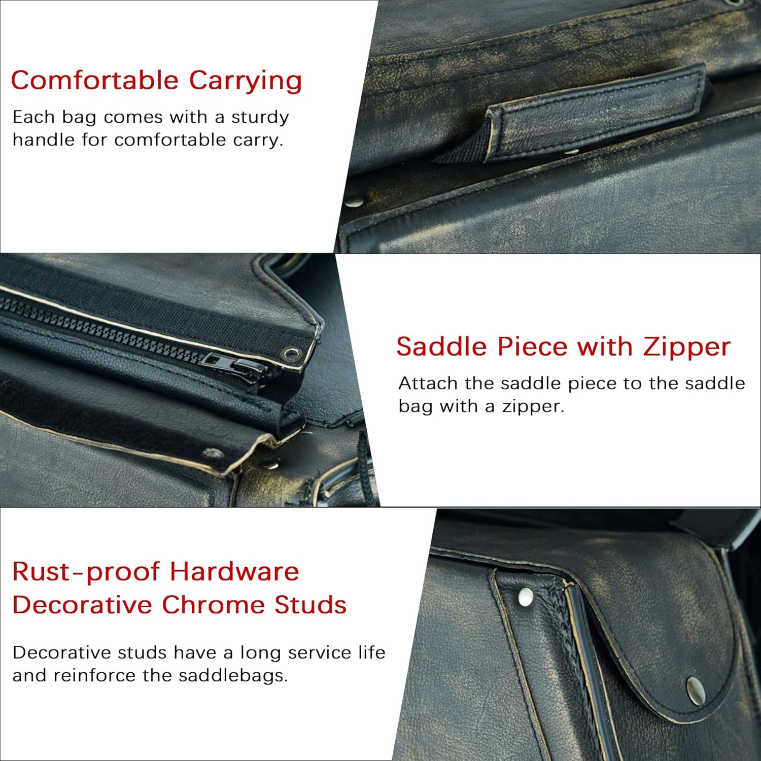 - [Naked Cowhide Leather Saddlebags] - The motorcycle saddle bags are made of genuine naked cowhide leather. Quality leather construction ensures the durability of the saddle bags and keeps your stuff dry from being wet by rain. Leather material resists dust and makes the saddlebags easy to clean. Thick leather and reinforced stitching ensure strong tear resistance of the leather motorcycle side bags.