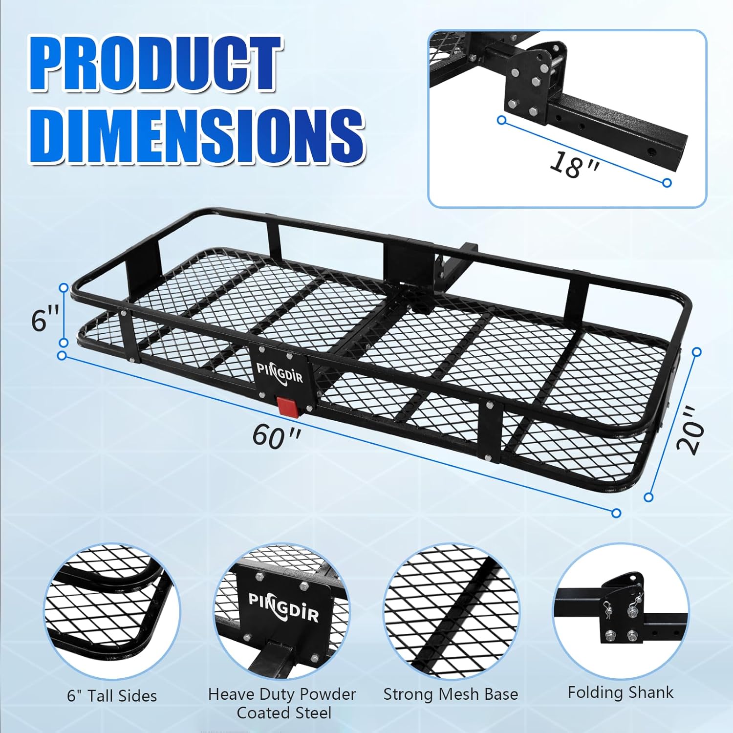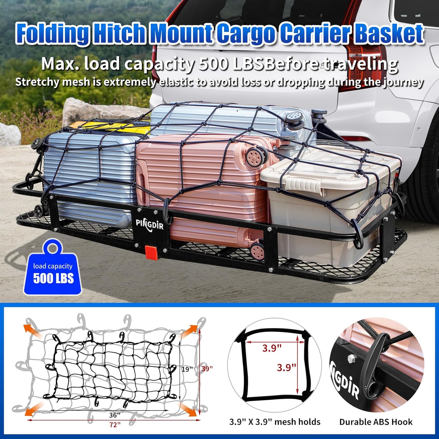 Folding Hitch Mount Cargo Carrier Hitch Rack Basket 60"*21.5"*6" Hauling Weight Capacity of 500 Lbs, Waterproof Cargo Bag 58" 19" 24", with Hitch Stabilizer,Cargo Net and Ratchet Straps