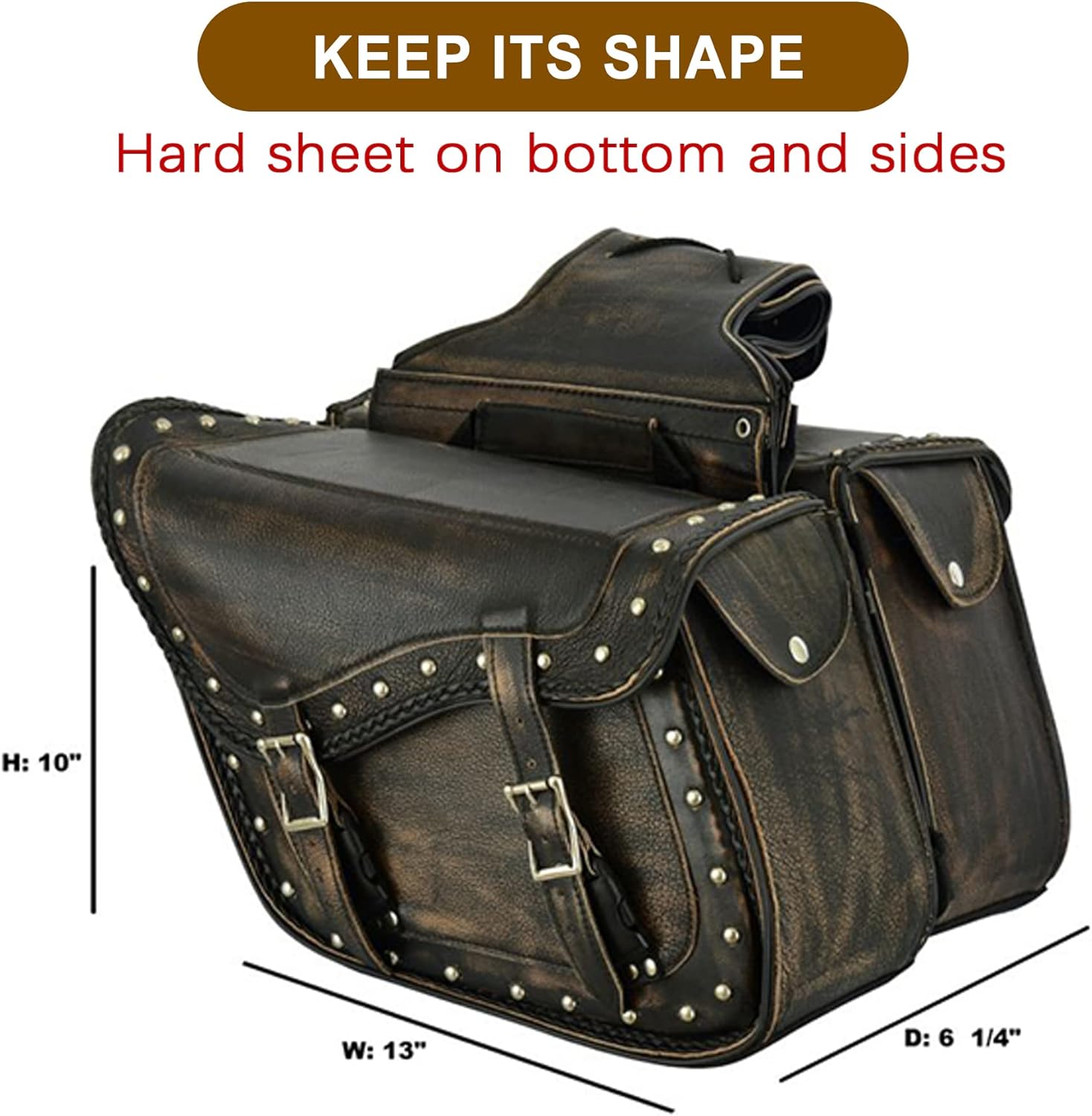 - [Fashion Appearance and Flap Design] - Thin braiding is built along edges and makes the saddlebags more fashion. The distressed brown saddle bags will give your motorcycle a new look while also greatly expand practicality of bike. Flap design and strong stitching make sure that the saddle bags will not lose luggage when riding fast on bumpy roads. Flap design helps prevent dust or rain from entering and keep items clean and dry.
