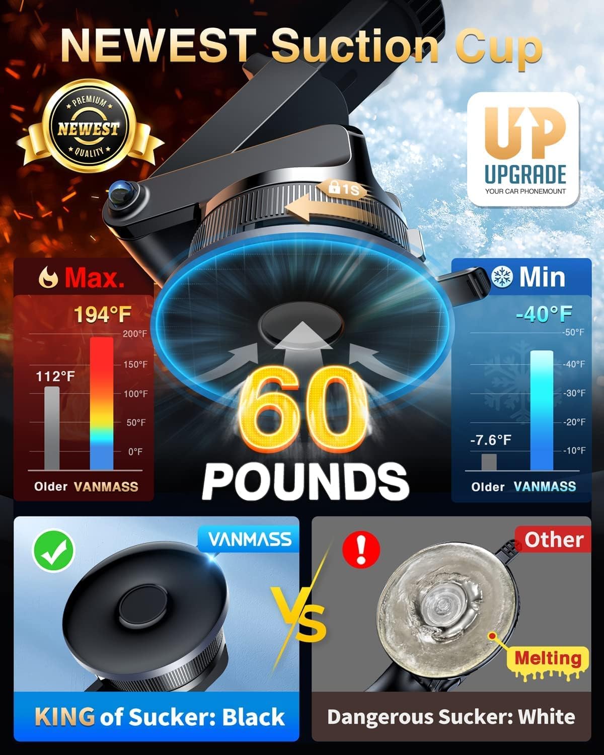 - ăHigh-end = Quality Materials + Grandmaster DesignăVANMASS car phone mount made of PC+ABS material has passed 4 environmental reliability tests and has a temperature resistance range of -40â to 194â, it is also highly resistant to UV rays (Ensuring reliability even in the sun), and the telescopic pole uses a reinforced sliding rail structure to greatly reduce wobbling during driving. This suction phone cradle obtained CP65 / REACH / RoHS safety certifications