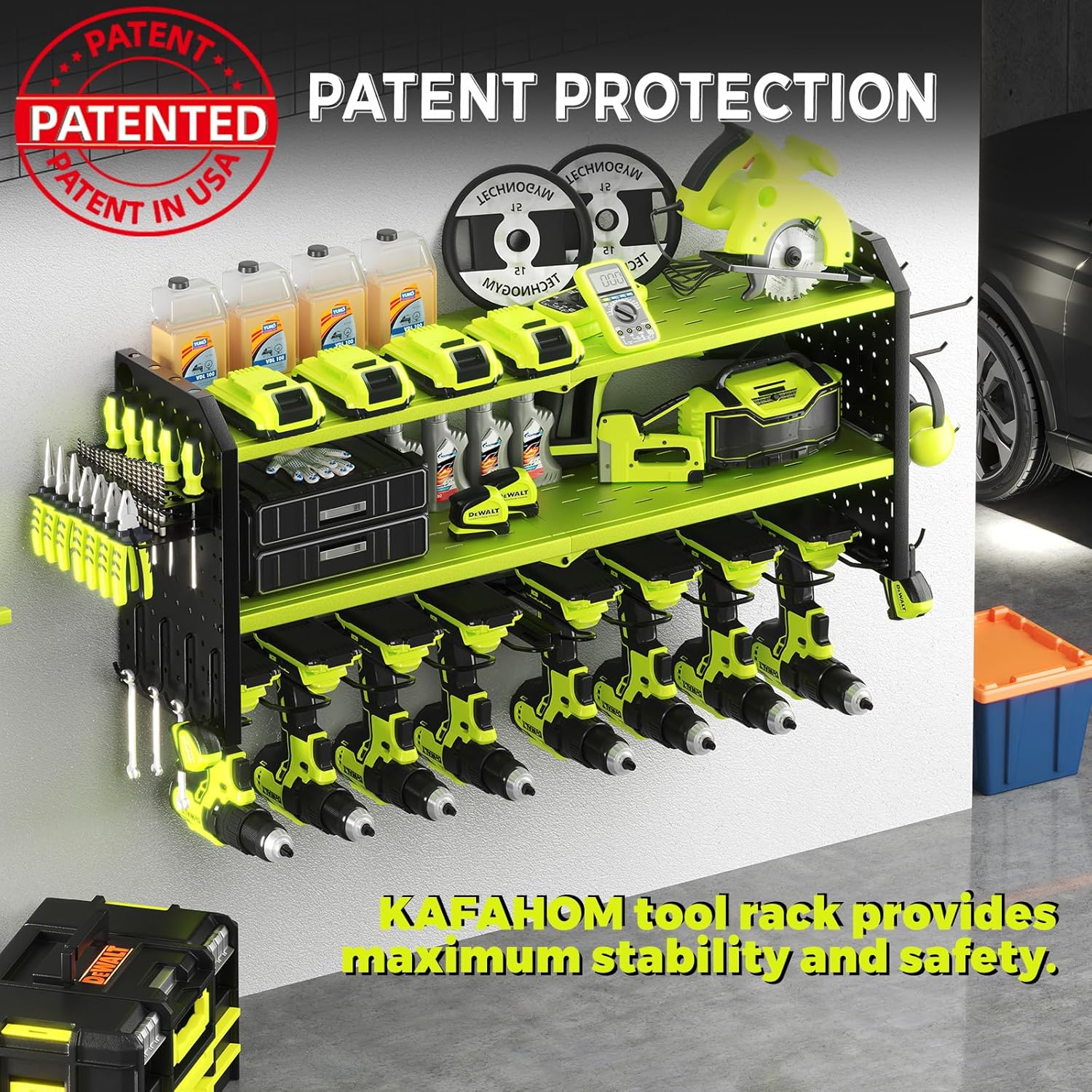 - STRUCTURAL OPTIMIZATION: The KAFAHOM top-of-the-line garage organization rack features a revolutionary structure design that provides exceptional stability and increased weight capacity for your power tools. Thanks to the optimized structural design and aspect ratio - not only is it can perfect for the 16" wall studs, but the utility cordless drill holder can be mounted on concrete, drywall, pegboard. Plus, the lower part can hold up to 8 heavy power tools.