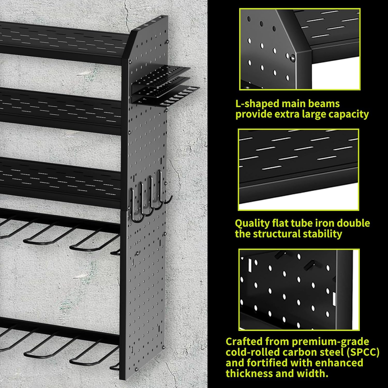 - COMPACT SOLUTION: KAFAHOM tool organization and storage has a high capacity for all your tools! With two downside racks, it can hold up to 8 drills and heavy-duty shanked power tools, while the 3 extra upper layers provide ample space for accessories such as hardware boxes, wrenches, screwdrivers, and pliers. With clever space design, our tool rack wall mount shelf helps free up space and keep your garage organization area clean and tidy.