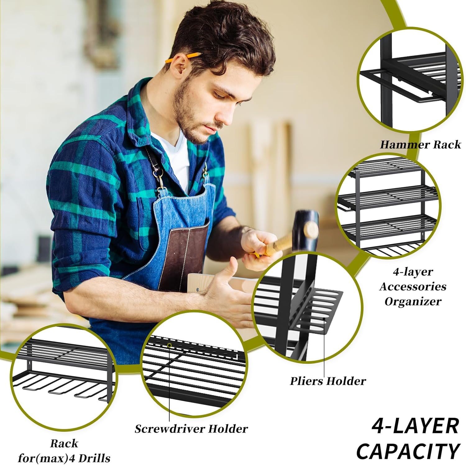 - EXTRA ROOMS FOR OTHER TOOLS: Good craftsmanship is about more than just power tools - KAFAHOM utility cordless drill holder adds 2 accessories for handy tools like pliers and hammers. The power tool organizer capacity over 7 pliers, and up to 25 screwdrivers and 7 hammers.
