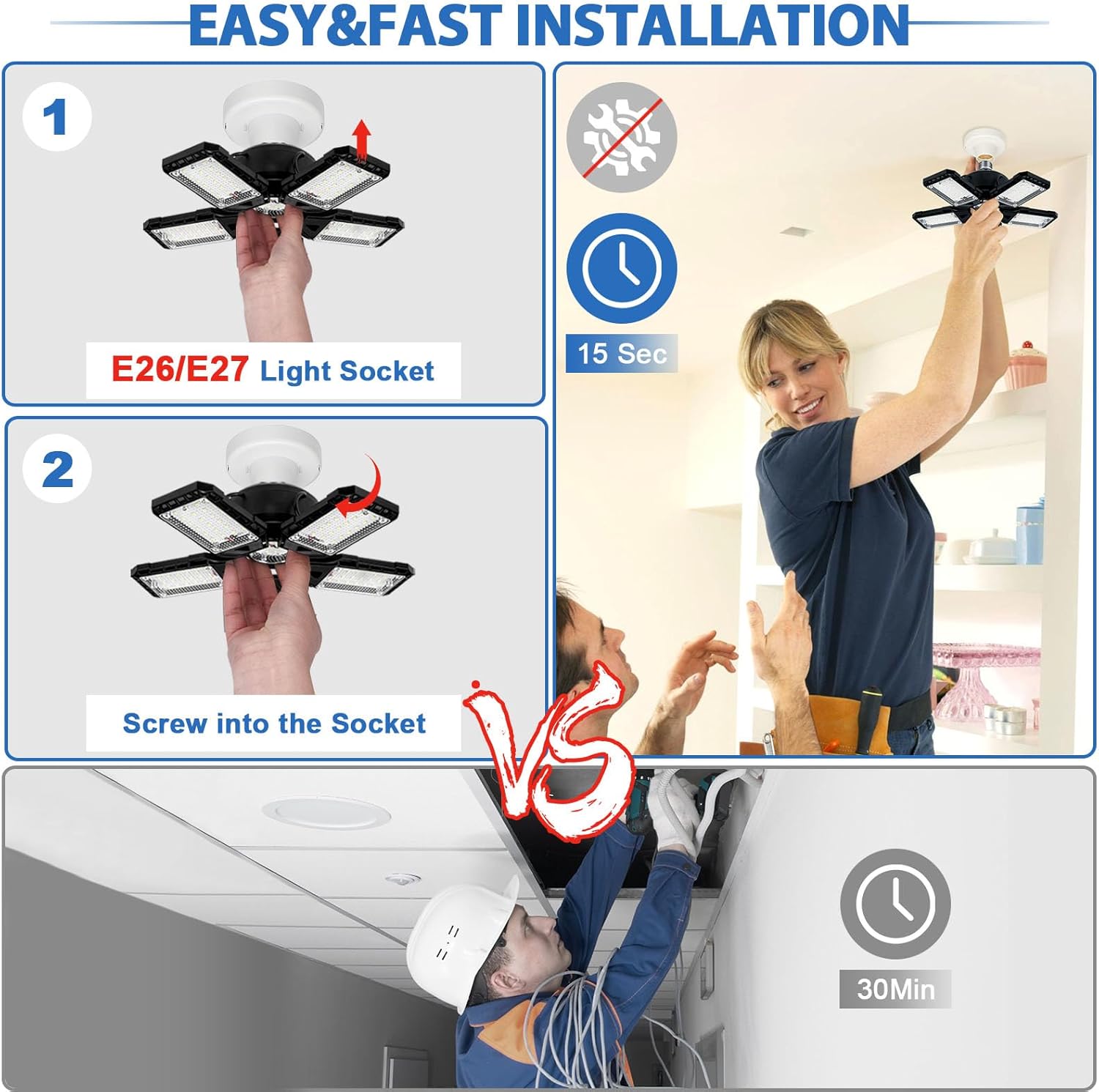 - 【5+1 Newest Garage Lights】With 5+1 deformable panels,the garage lights can be adjustable from 0 to 90 degree, which illuminate each corner of your garage in 360 full coverage without visual blind spots and dizziness. They will provide better light than 3, 4 and 5 panel garage lights on the market.