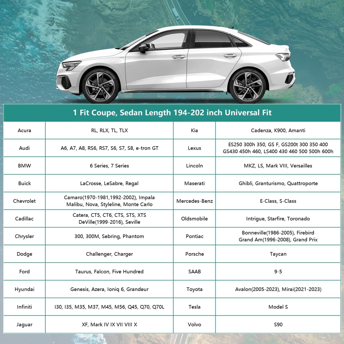- ăModel ChoiceăGUNHYI automobiles cover is suitable for Coupe, Convertible, Length 194 to 202 inch (Not for SUV Hatchback). For exmaple--Dodge Challenger, Hyundai Genesis, Jaguar XF/XJ, Tesla Model S, Audi A6/S6/A7/S7, Buick Regal/Lacrosse, Cadillac Seville/CTS/XTS, Chevy Impala, Ford Taurus, BMY 5 Series/6 Series, Infiniti Q45/Q70, Lincoln MKZ, Benz S-Class/Cls-Class, Pontiac Firebird/GrandPrix, Porsche Panamera/Taycan, Toyota Avalon, Vw Phaeton, Volvo S90 etc.
