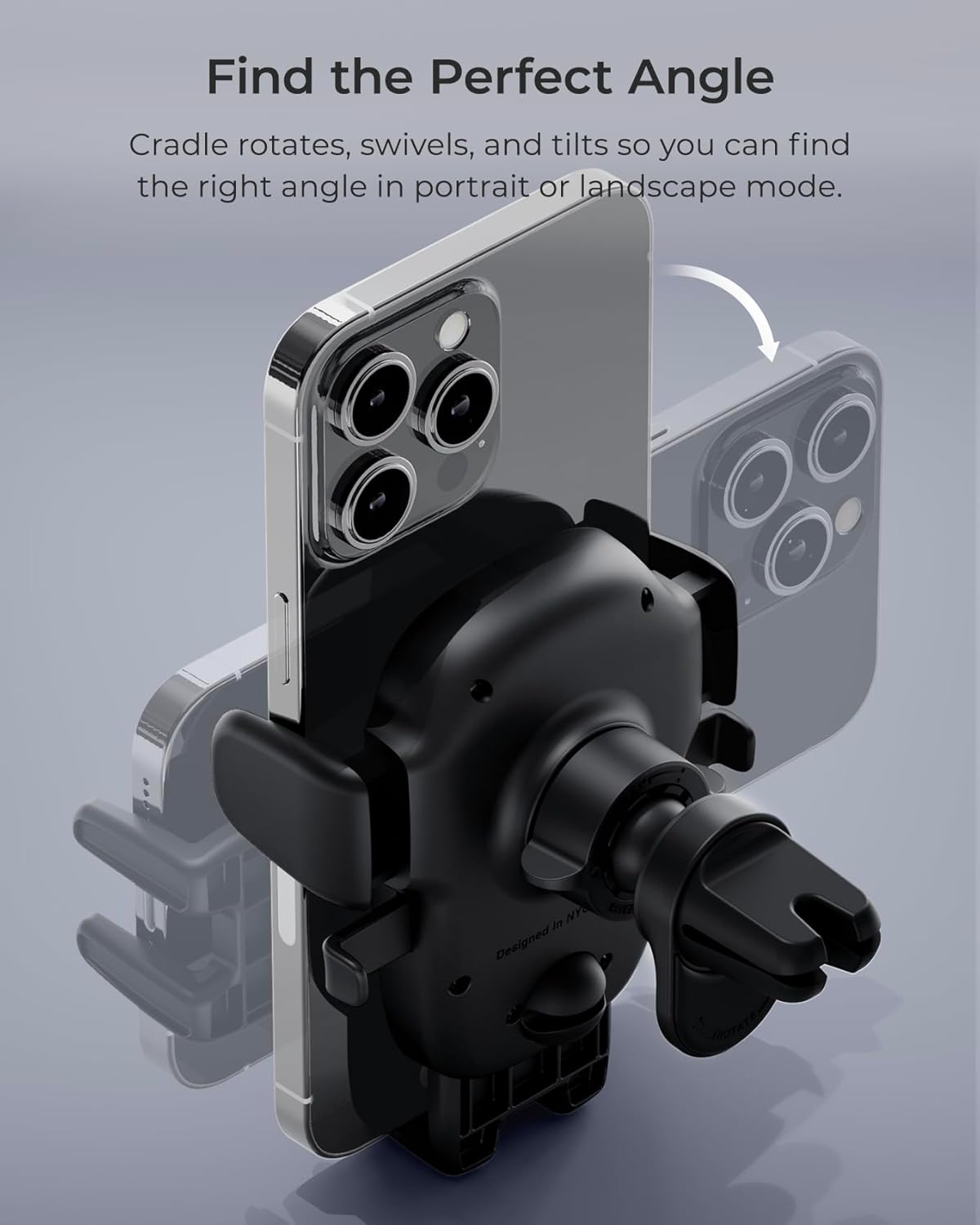 - Quick and Secure Installation: Installs in seconds on both horizontal and vertical vehicle air vent blades via rubber prongs that provide a vise-like grip. Additional support foot prevents the mount from drooping even when holding larger, heavier phones.