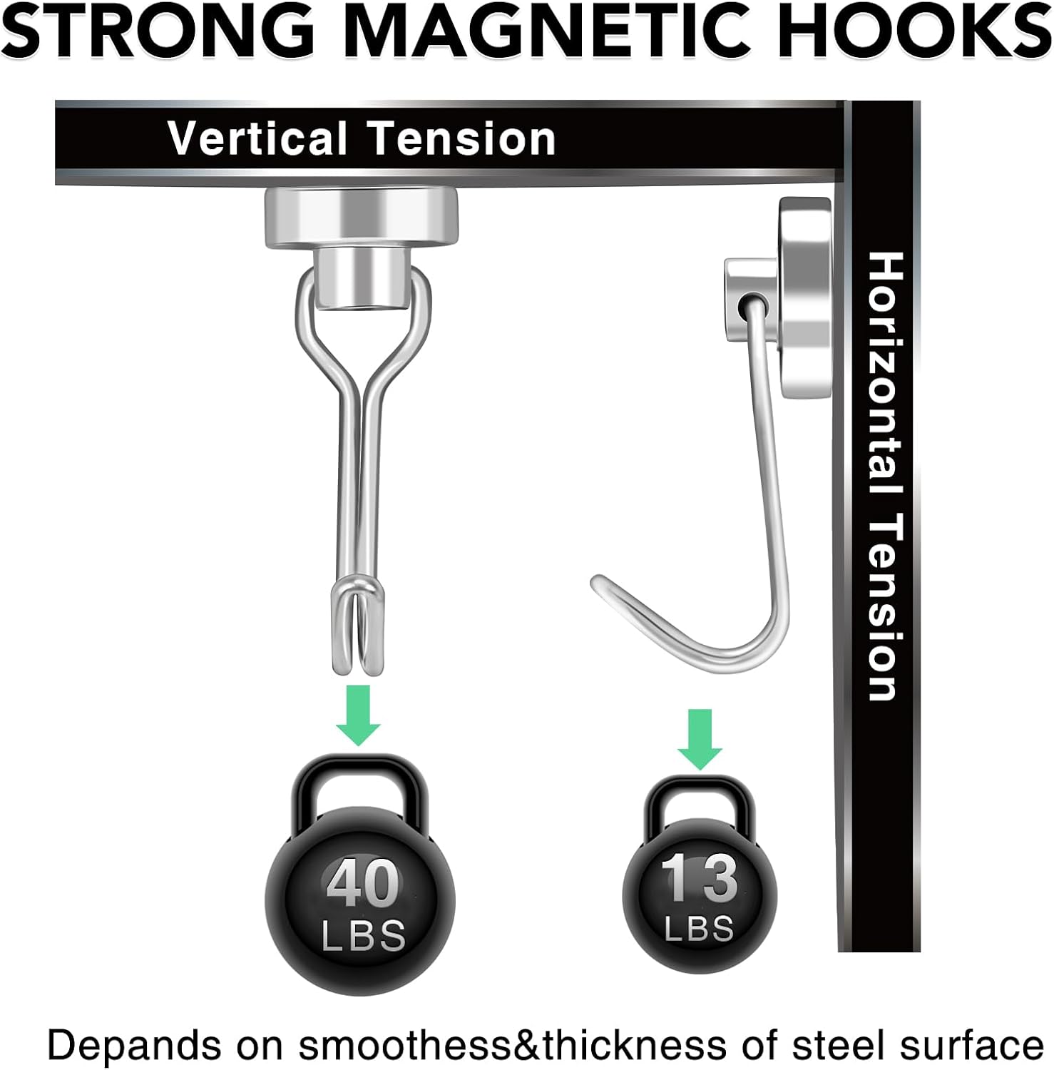- 【Hanging Capacity】- The heavy duty magnetic hooks are made of neodymium magnets offer more than 40lbs attractive force on horizontal application, reduce to nearly 13lbs if used vertically. Whether you want to hang towels, bags, or other items, our magnetic metal hooks will securely attach to any metallic surface, providing a convenient and practical organizational solution for your living space