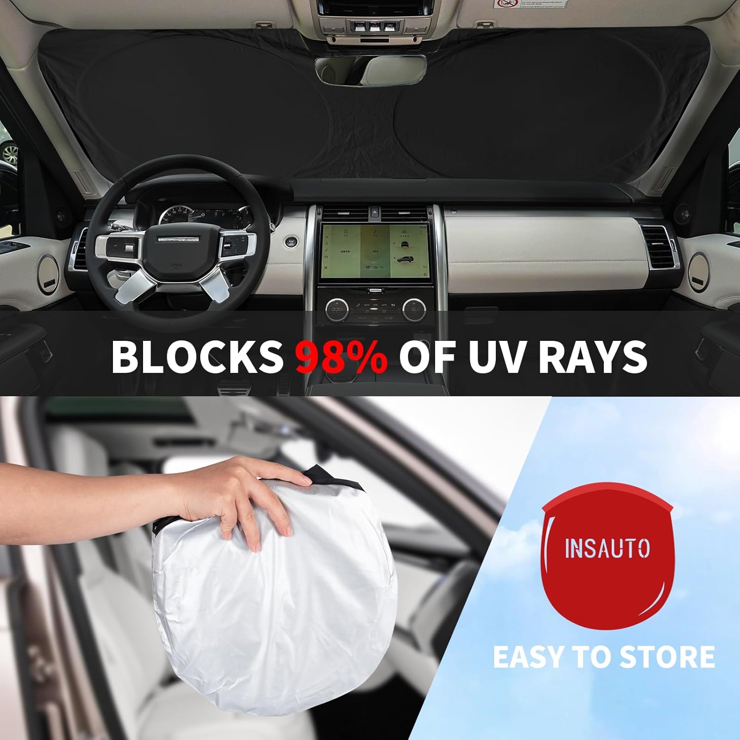 - 【UV Protection】INSAUTO Folding windshield sun shade is made of high quality 210T polyethylene microfiber,Compared to the ordinary version of the easy to fall off the silver powder layer, Our upgraded Silver reflective surface can reflect 99% of ultraviolet rays-- great sun reflector. The shade has better performance,better shading,better reflective refraction. Blocks heat & sun,Keeps your vehicle cool.