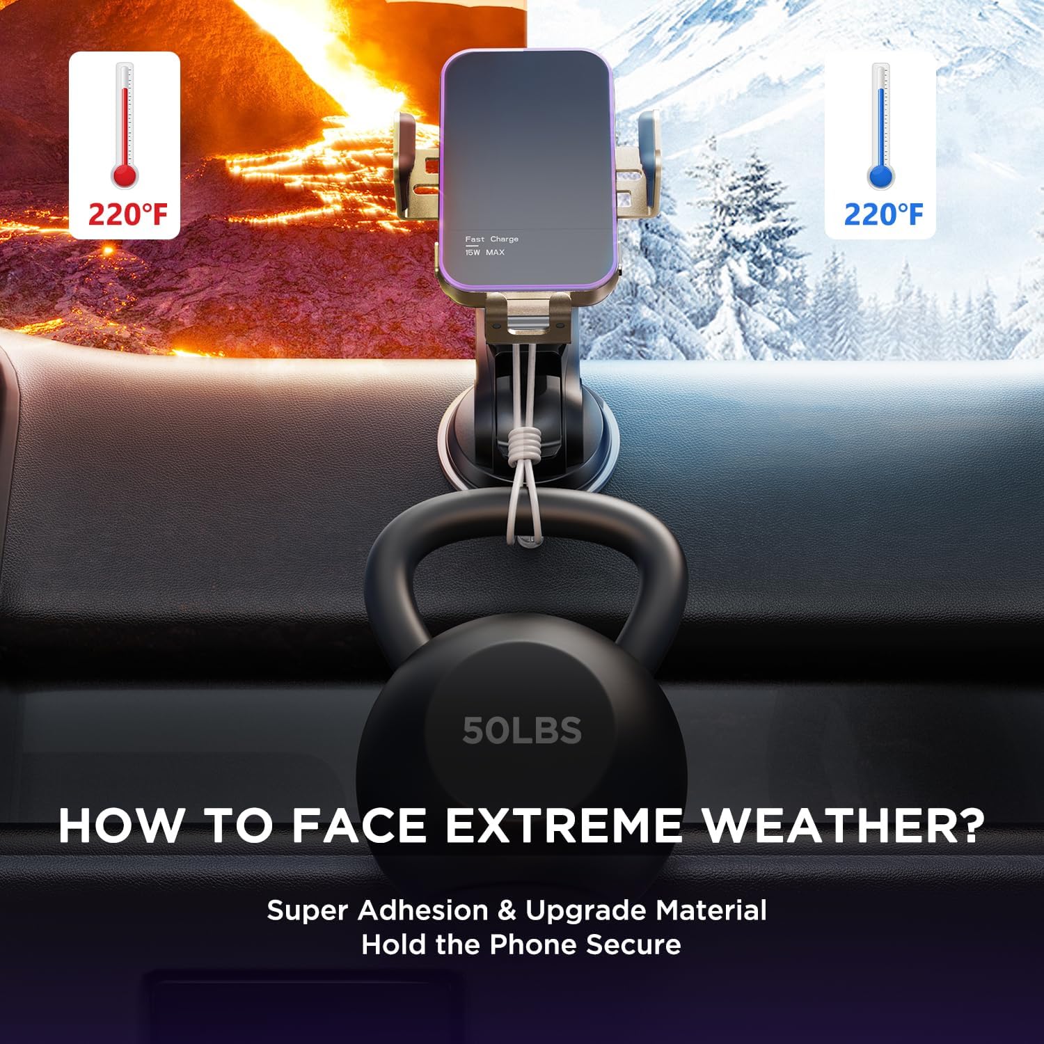 - 【SECURELY SUCTION POWER Up to 50LB】We greatly improved the suction power and the material of phone holders for your car based on the market's feedback. Whether it's extreme weather, sharp turns or steep hills, the car mount always holds up and stays in place. Suction Cup can be reused and restored by simply rinsing under warm water and air drying