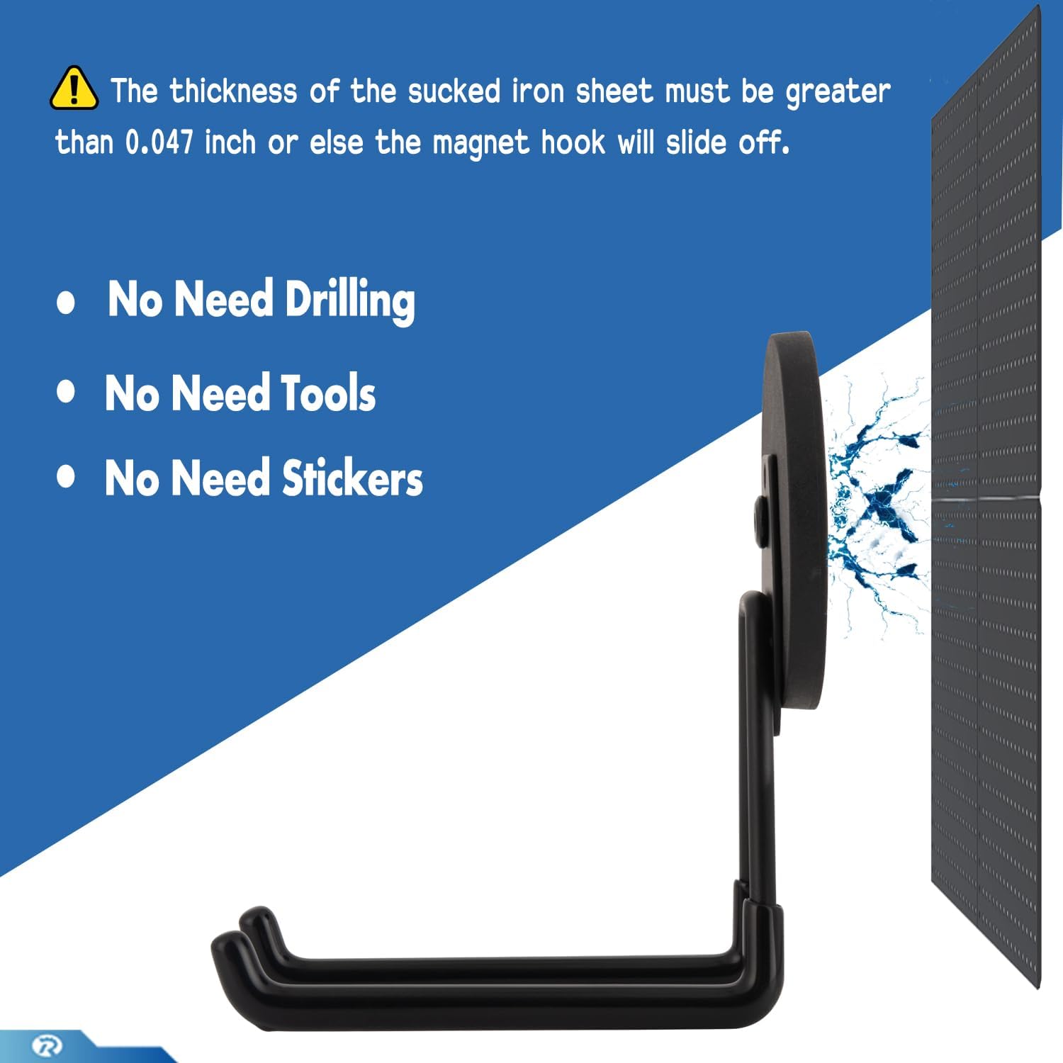 - Each magnet base is equipped with 12 rare earth magnets inside.The thickness of the sucked iron sheet must be greater than 0.047inch/1.2mm.or else the magnetic hook will slide off.