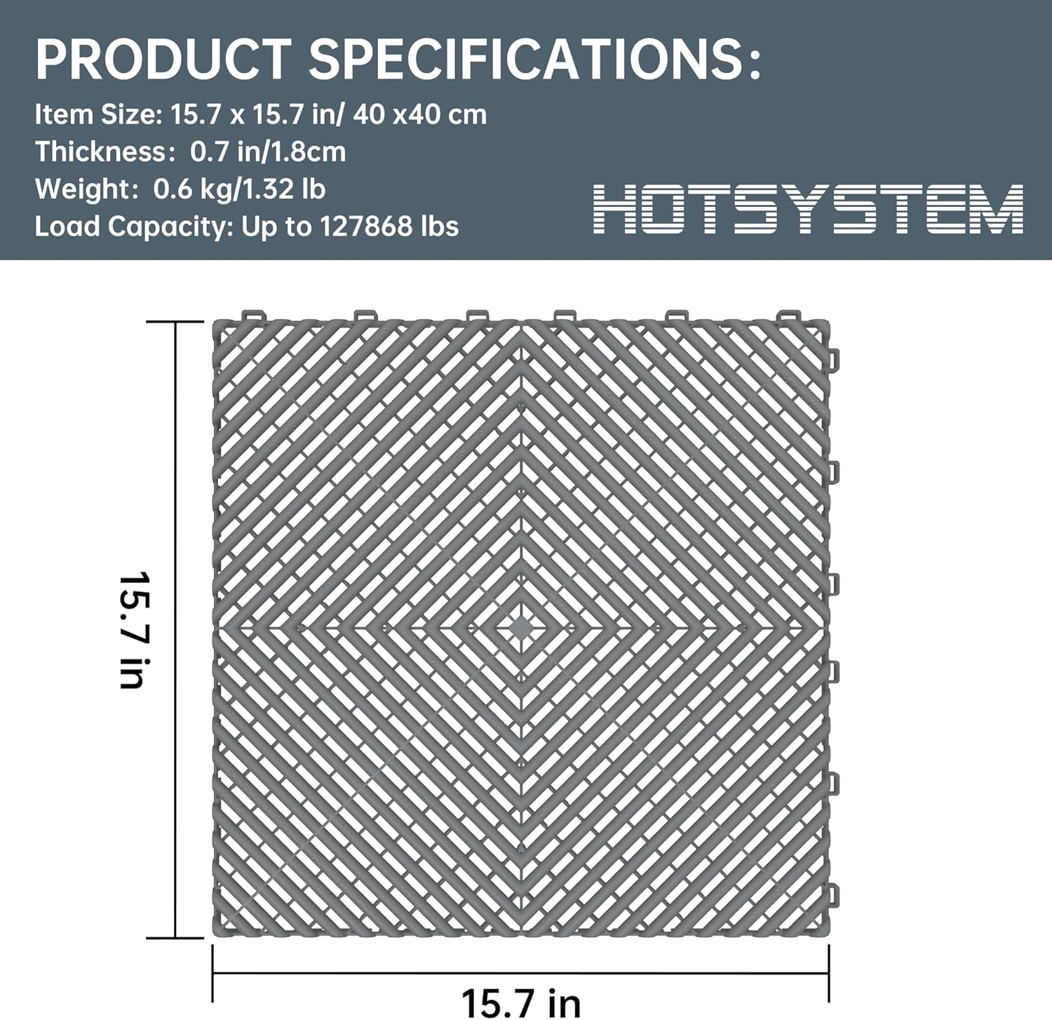 - 【Durable】Our garage tiles provide unmatched protection for your garage. They are made of thicker polypropylene. These durable tiles are designed to last and extend the life of your garage floor. Whether you're parking, operating machinery, or playing with toys, our garage floor tiles will keep your garage floor looking great for years to come. Choose HOTSYSTEM for reliable, long-lasting garage floor protection.