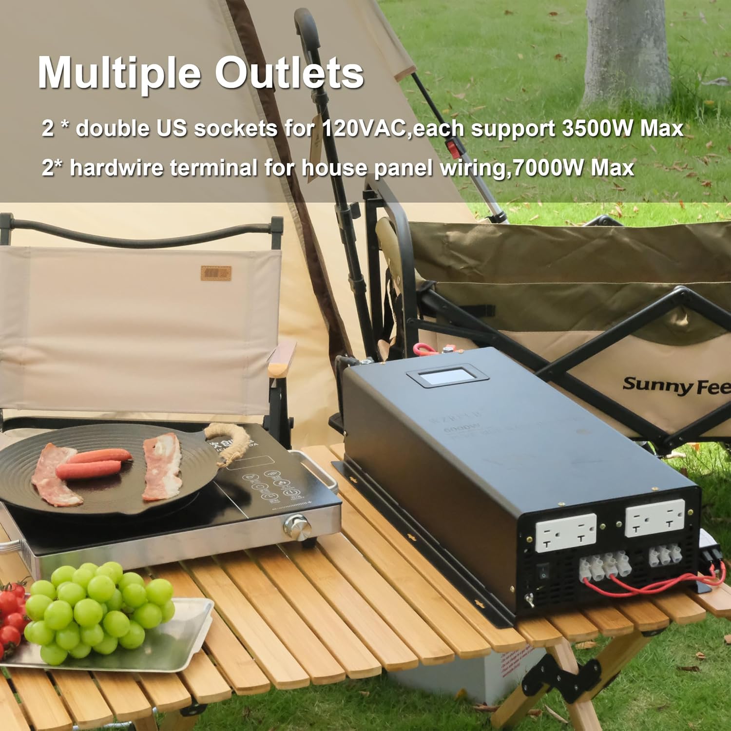 - POWERFUL: 7000 watts continuous, 14000 watts peak power, 24 volt DC to 120V 240V AC split phase true sine wave inverter, built-in soft starter, high frequency design with high surge capability to power demanding loads like air conditioner, refrigerator, power tools, and more