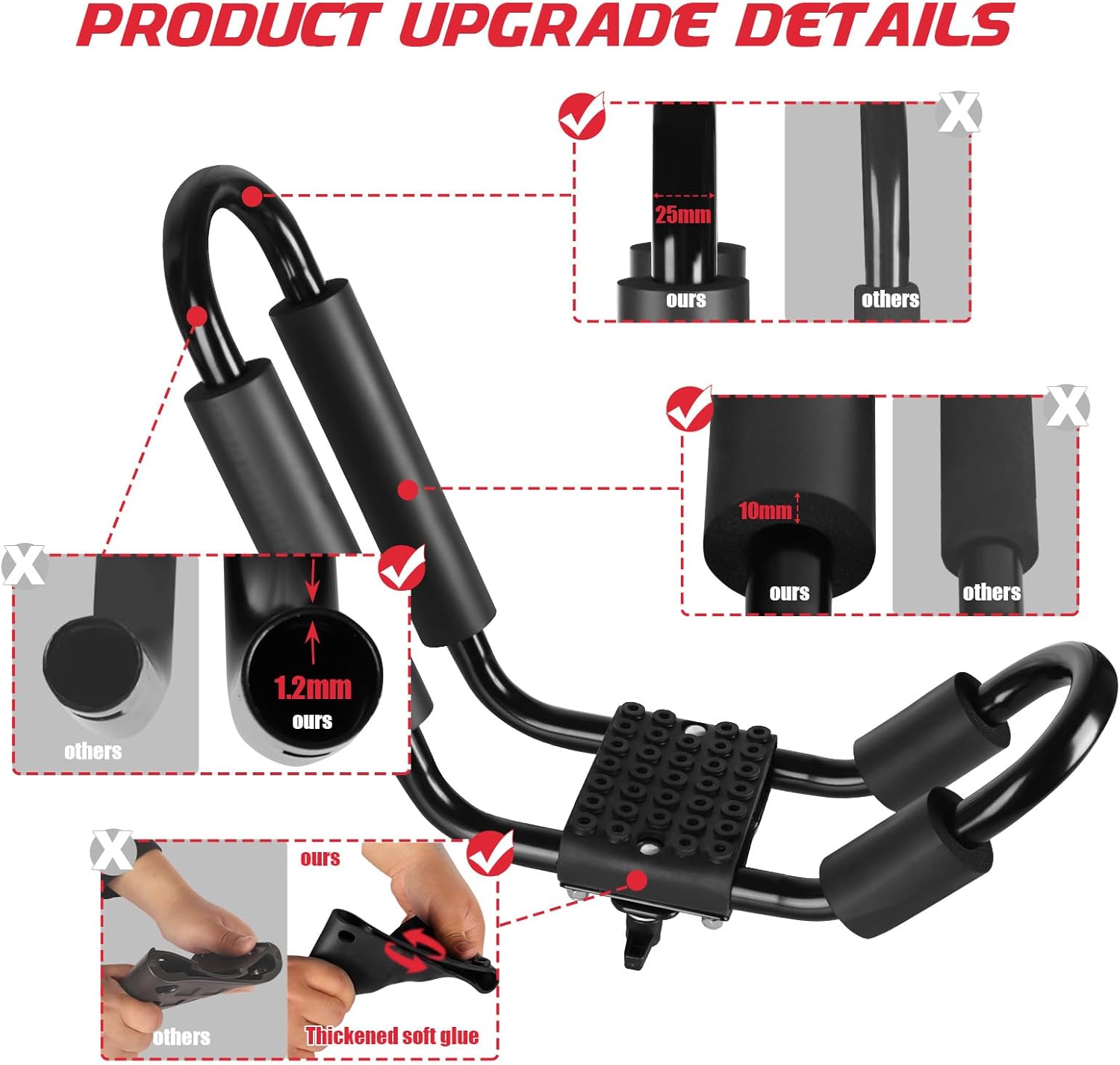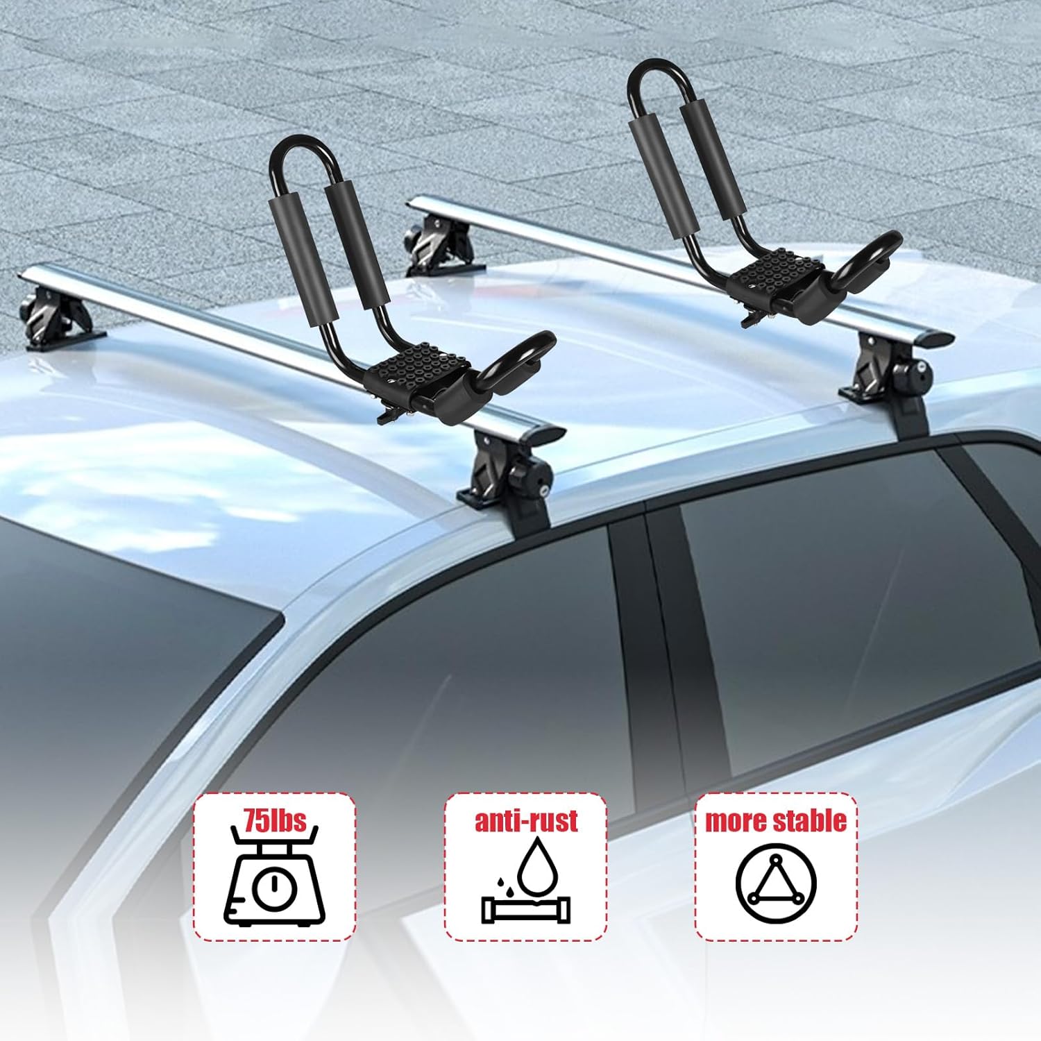 - ăUpgrade Thicken DesignăOur kayak roof frames are made of high-strength carbon steel. The thickened tube wall (1.2mm) and diameter (25mm) make the roof frame stronger. The widened design can support a heavy kayaks up to 75lb. Rust-resistant and corrosion-resistant material features you can keep on the car roof for a long time