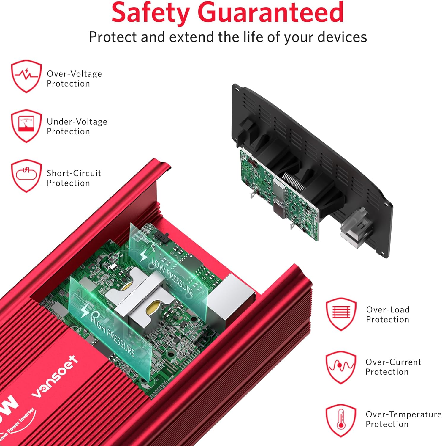 - Isolated Voltage Protection: With isolation voltage protection, offering comprehensive safeguards against over-voltage, under-voltage, overheating, overloading, reverse polarity, and short circuits. Importantly, it prevents excessive battery drain due to under-voltage protection. Automatically sensing overload conditions, the inverter halts AC power output when the load exceeds 500W, requiring power off/on to reset the overload condition, indicated by a flashing red light.