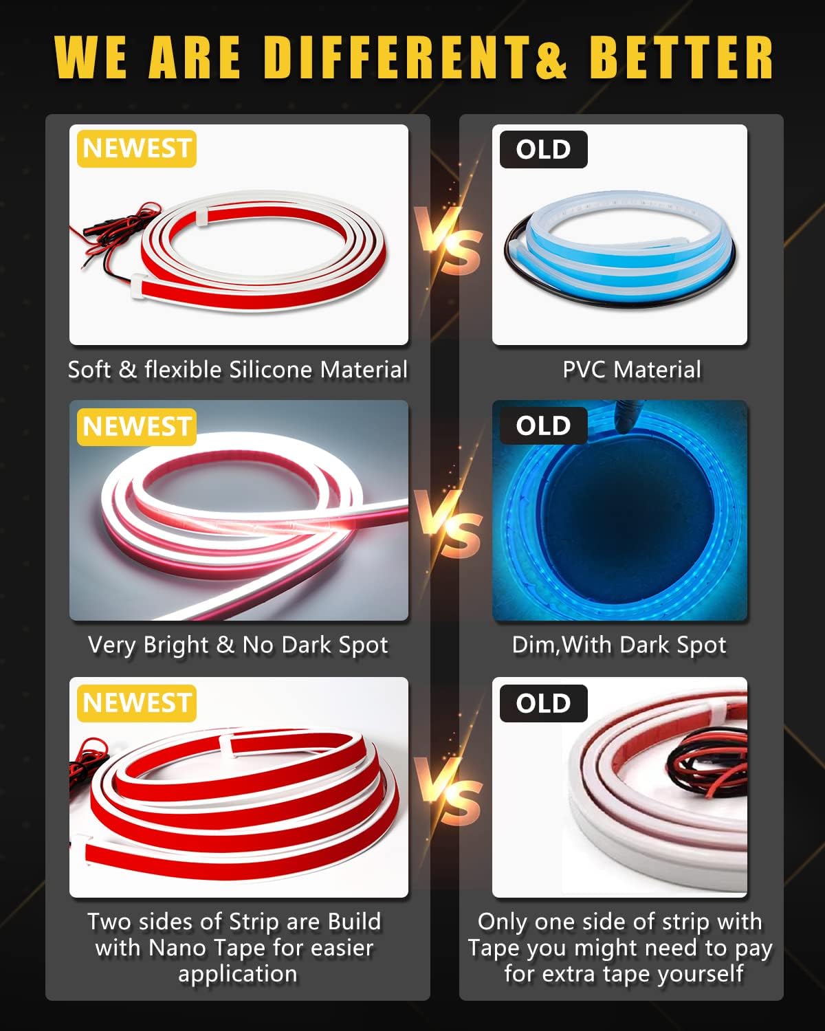 - ăFuse ProtectionăThe Car led strip light is made of soft silicone with heavy duty Nano Tapes on both sides,Super Bright,No dark Spots.Short circuit protection to enhance the safety.