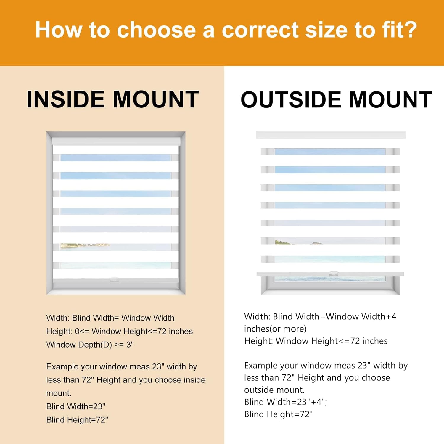 - 【How to choose a correct size to fit? Example your window meas 23" width x less than 72" Height.】INSIDE MOUNT: Window Width is Blind width. Blind Width=23"; Blind Height=72". OUTSIDE MOUNT: Plus at least 4" is blind width, Blind Width=23"+4"=27"; Blind Height=72".【Pls Note】Fabric width will be 0.22" narrower than the size of the blind.