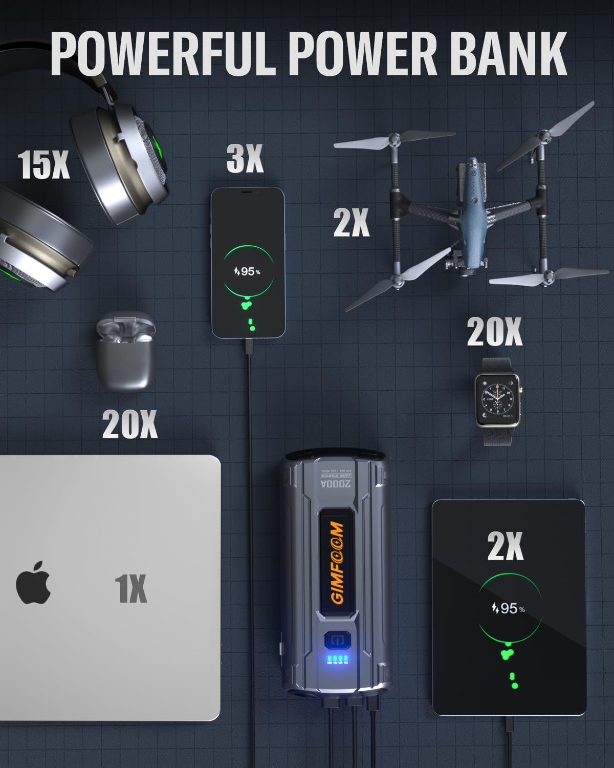 - ăDUAL USB FAST OUTPUTă The portable car jump starter is equipped with 2*USB ports (5V/3A & 5V/2.4A) fast output design. In addition, the jump pack can quickly charge your headphones, cell phones, tablets, drones, cameras, and other USB devices and more.