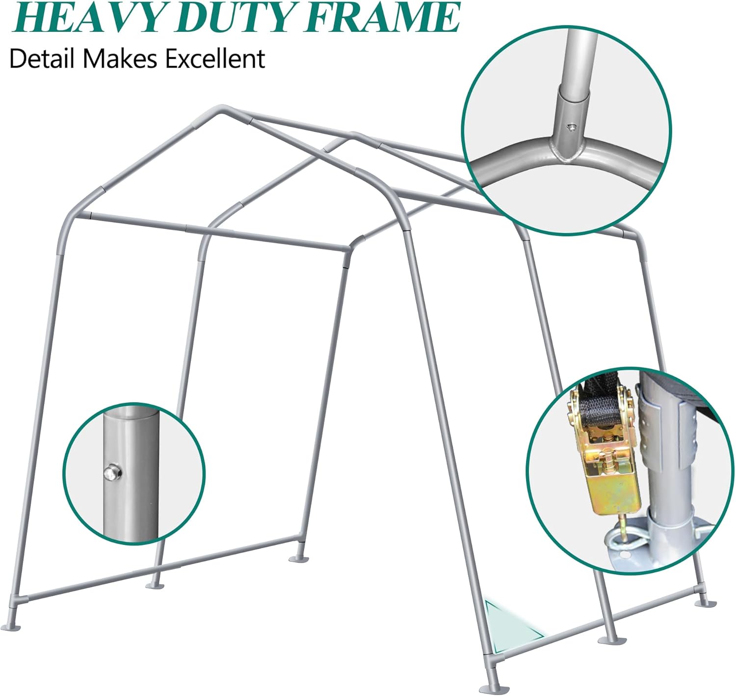 - 🧰STURDY STEEL FRAME: The outdoor storage shelter shed is made of a rust resistant heavy-duty steel frame. SIZE: 8FT*8FT*7.6FT. The outdoor portable garage storage shed can hold Bike, ATV, Motorcycle Shelter, garden tools, lawnmower, patio furniture storage and so on