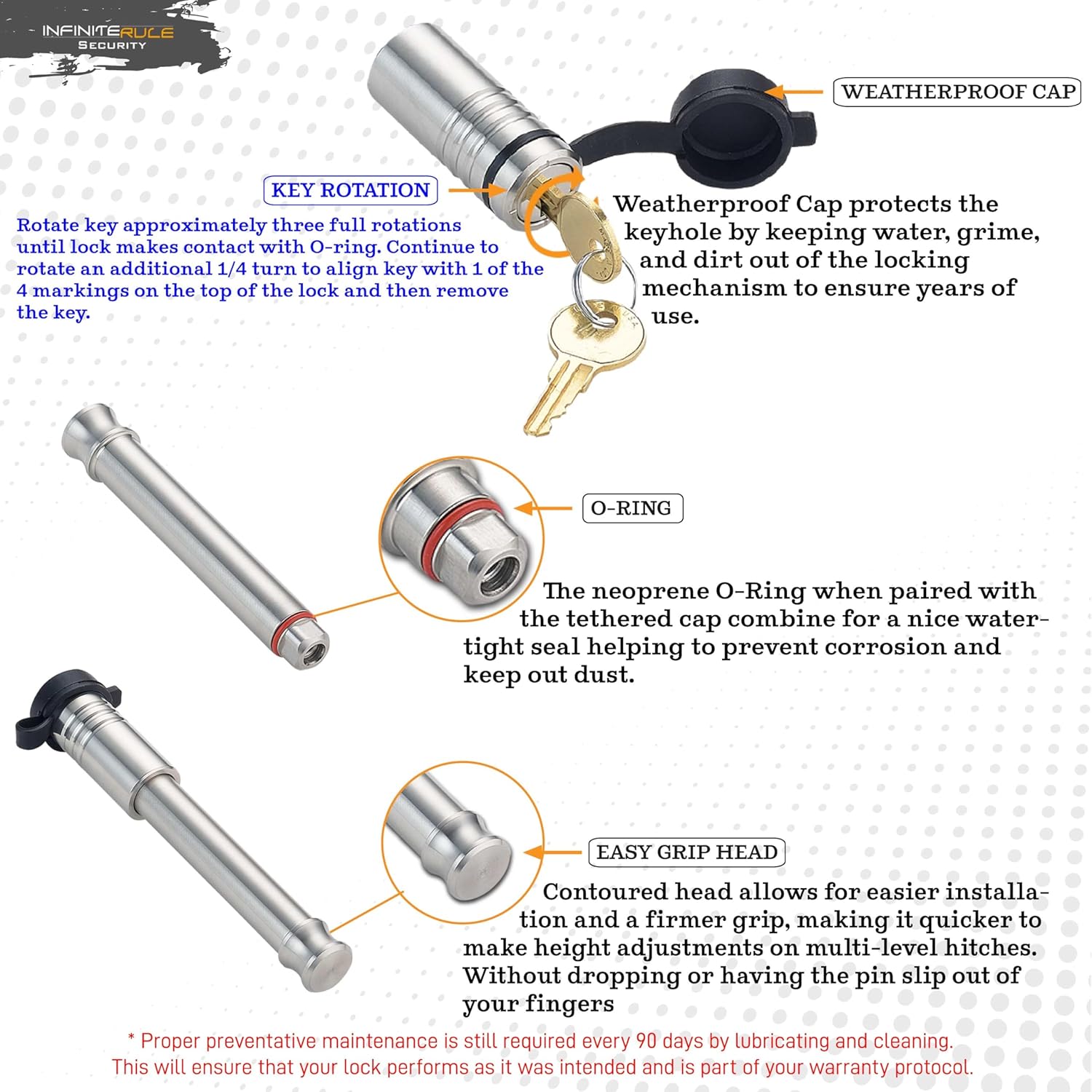 - **DURABLE** - No Rust Trailer Hitch Pin. Resists Corrosion With Premium Materials. Tight Fit hitch lock With Weatherproof Rubber Cap And O-ring To Protect From Rain Water, Grime, Dirt, And Debris.