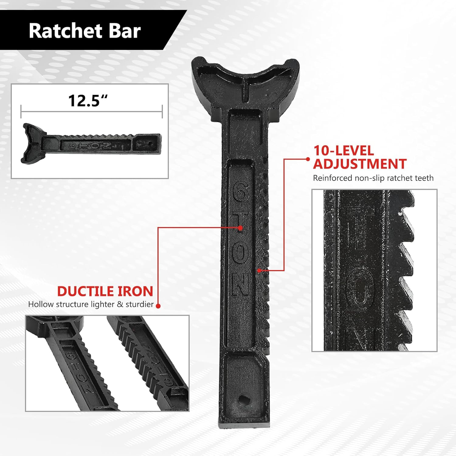 - [Sturdy Ratchet Bar]: Multi-position ratchet bar is made of high-quality cast ductile iron, with serrated design, which can quickly adjust the height and lock in place