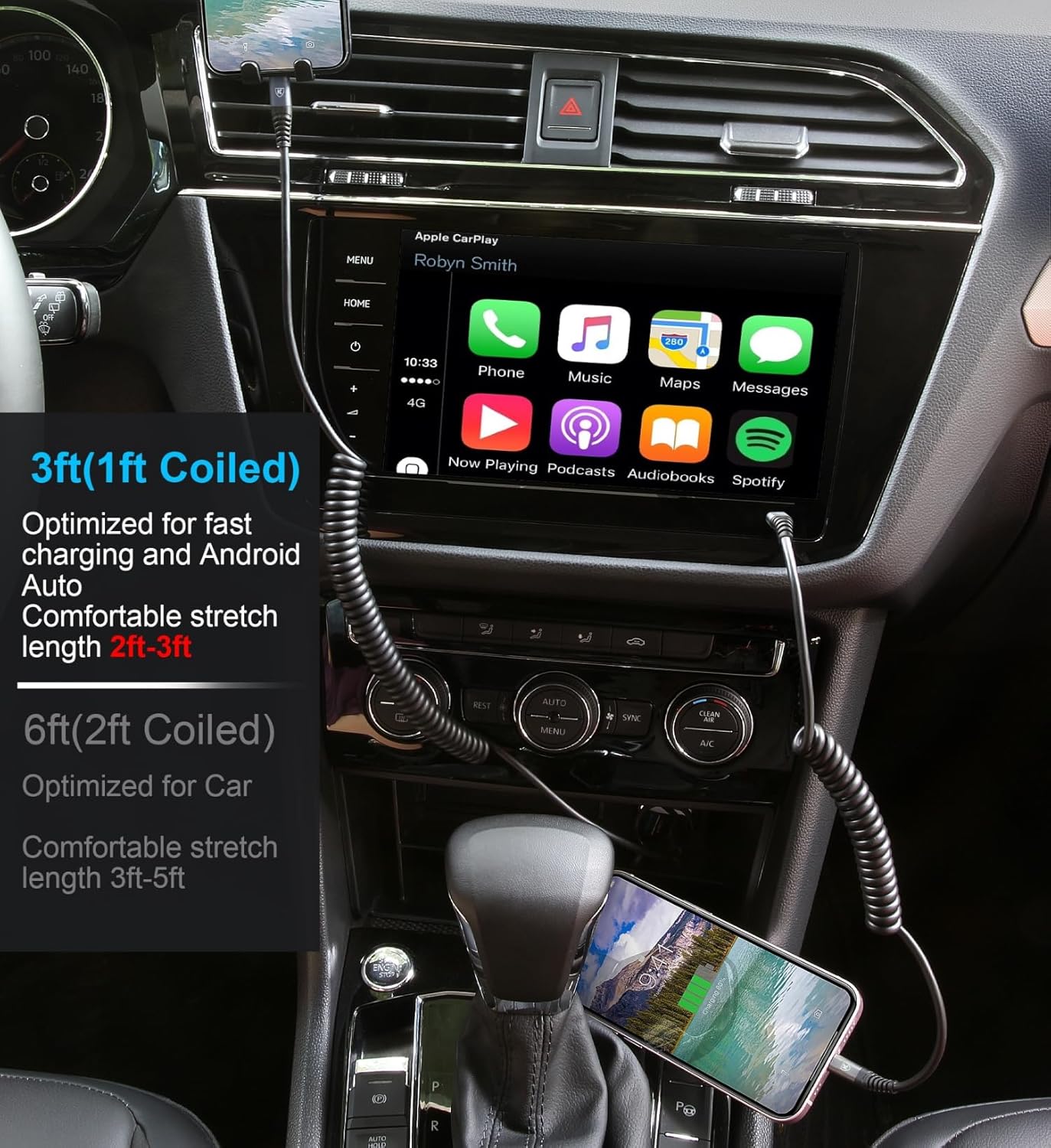 - Elastic Coiled Lightning Cable : Coiled lightning cable 1FT (stretchable to 3FT, comfortable stetch length 1.5ft-2ft) , coiled lightning cable 2FT (stretchable to 6FT, comfortable stetch length 3.5ft-4ft) and bounce back to normal length. You can use it in the front seat of your car and store your iPhone device in a compartment or on the phone holder of the car.