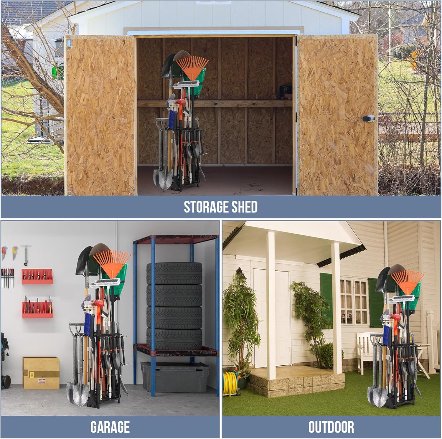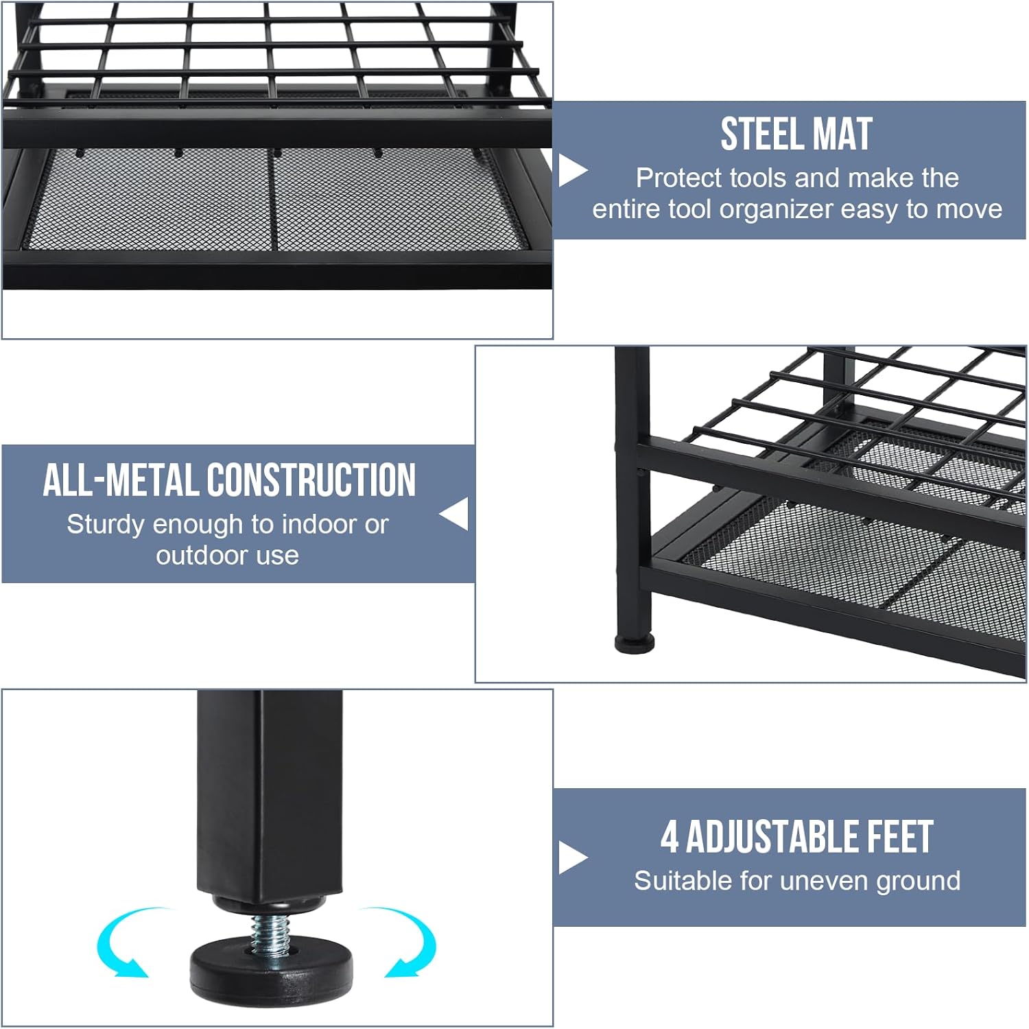 - Durable Heavy Duty Steel: This garage tool storage made of a durable coated steel frame that's sturdy enough to withstand indoor or outdoor use. In contrast to plastic tool rack, ours is constructed from the high quality steel, making it rust-resistant and corrosion-resistant.With steel mat to protect tools and make the entire tool organizer easy to move