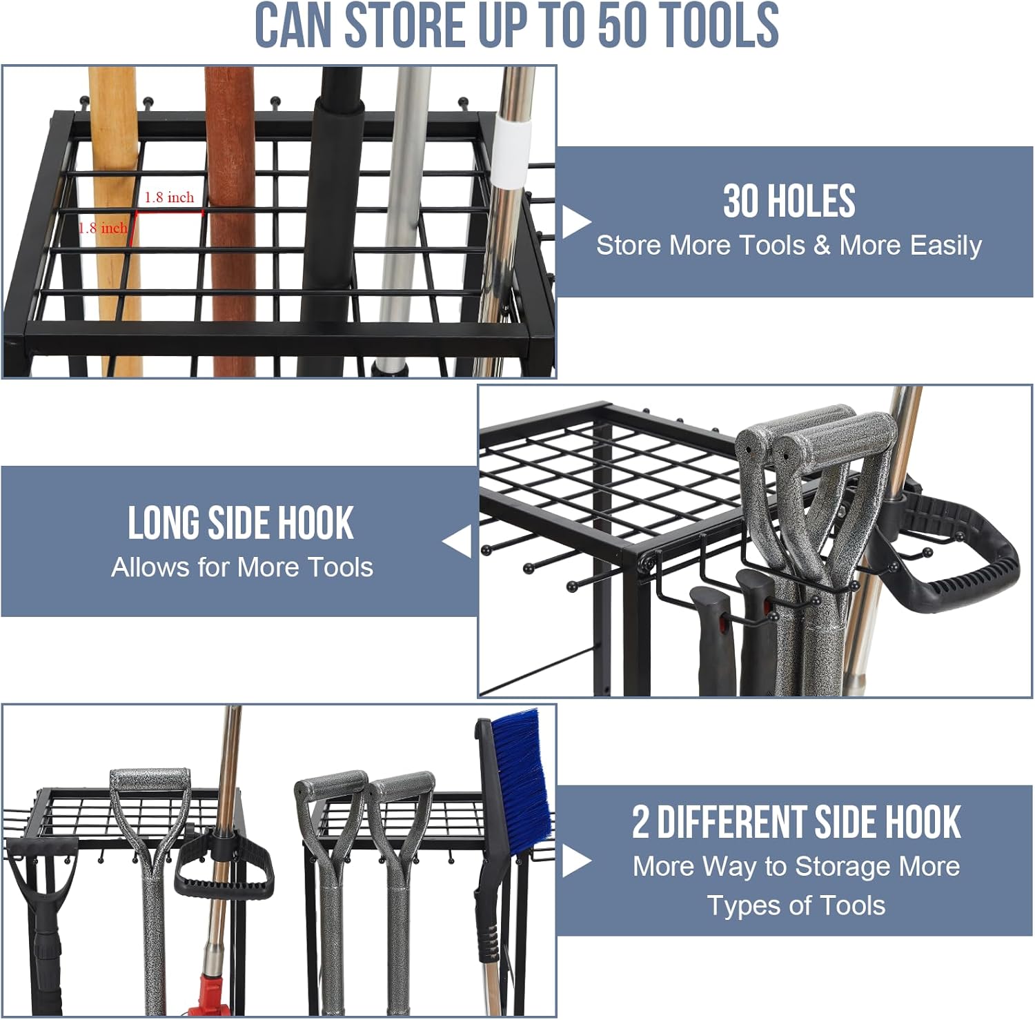 - Large Capacity Garage Organizer: Our garage tool storage has both square holes and 2 different types of side hooks.Multiple kinds and sizes of tools can be well stored. 2 types of side hooks of the organizer allow the D-handle tools or small garden tools to be placed. 30 holes allows to hold a large number of long handled tools