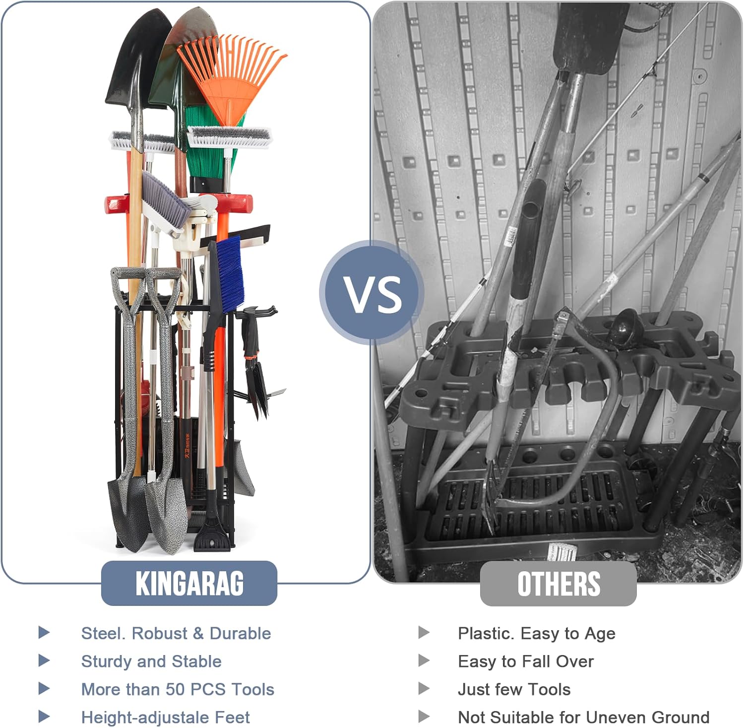 - Multifunctional Garden Tool Organizer: Garden tool storage can organizes up to 50 garden tools, including yard tools, farm tools, lawn tools, and cleaning equipment etc. Provide large capacity in a compact size. It simplifies tool storage and organization. Height-adjustable feet suitable for uneven ground. Suitable for garage, garden, shed, outdoors and backyards