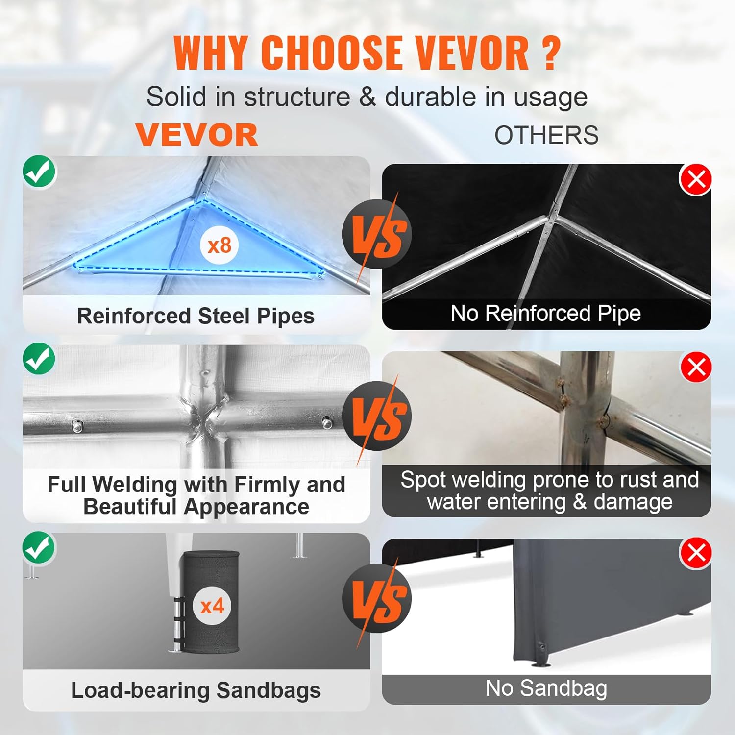 - 3. **Heavy-Duty Metal Frame**: Built to withstand the test of time, our car garage tent boasts eight sturdy φ38mm galvanized steel pipes with a unique double-walled structure and 0.8mm wall thickness. The rust-proof powder coating prevents cracking, peeling, rust, and corrosion, while eight stiffeners fortify the structure against shaking in windy and rainy conditions.