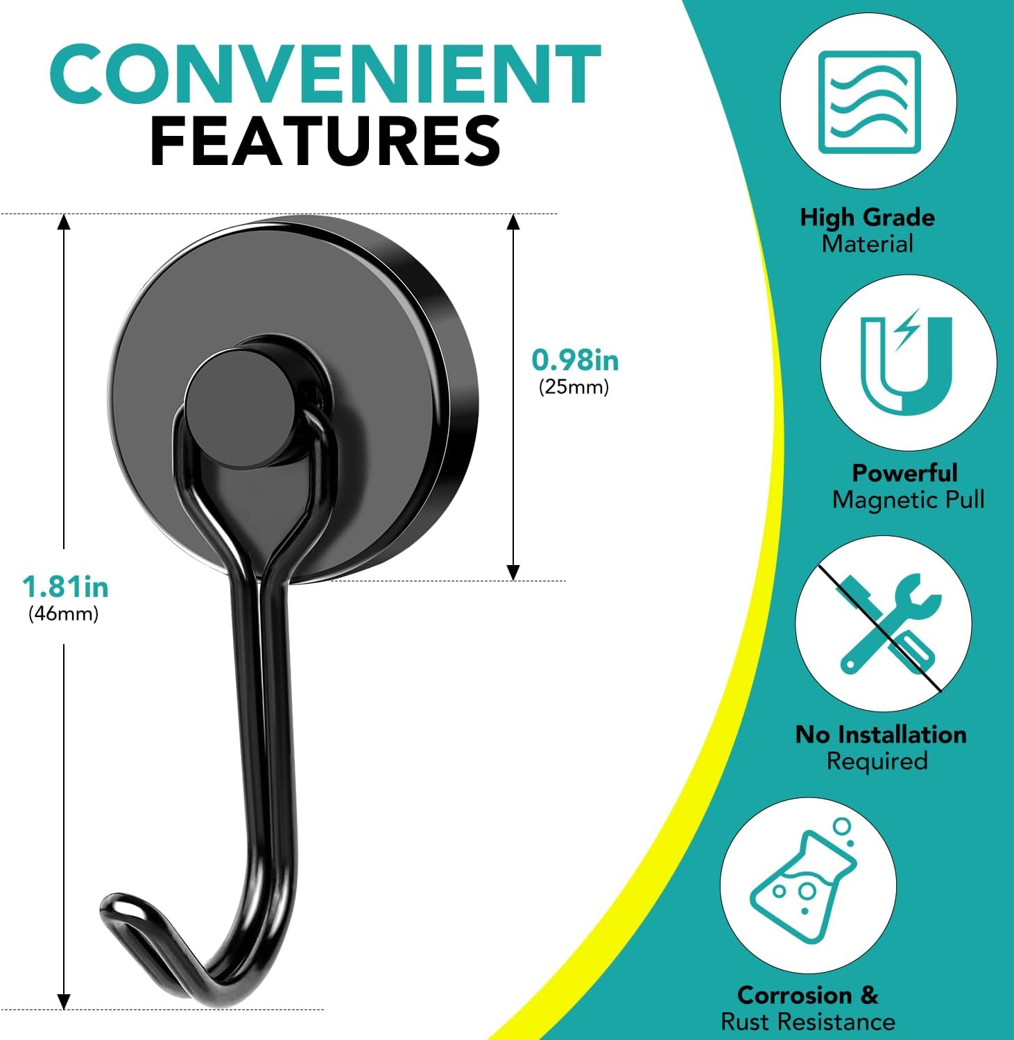 - 【High Quality Magnetic Hook】Our heavy duty magnetic hooks are made of neodymium magnets offer more than 80lbs attractive force on horizontal application, Enough magnetic pulling force allows you use it to hang coats, hats, towels, and tools such as scissors, pliers, shovels, etc., which will surely satisfy your daily needs