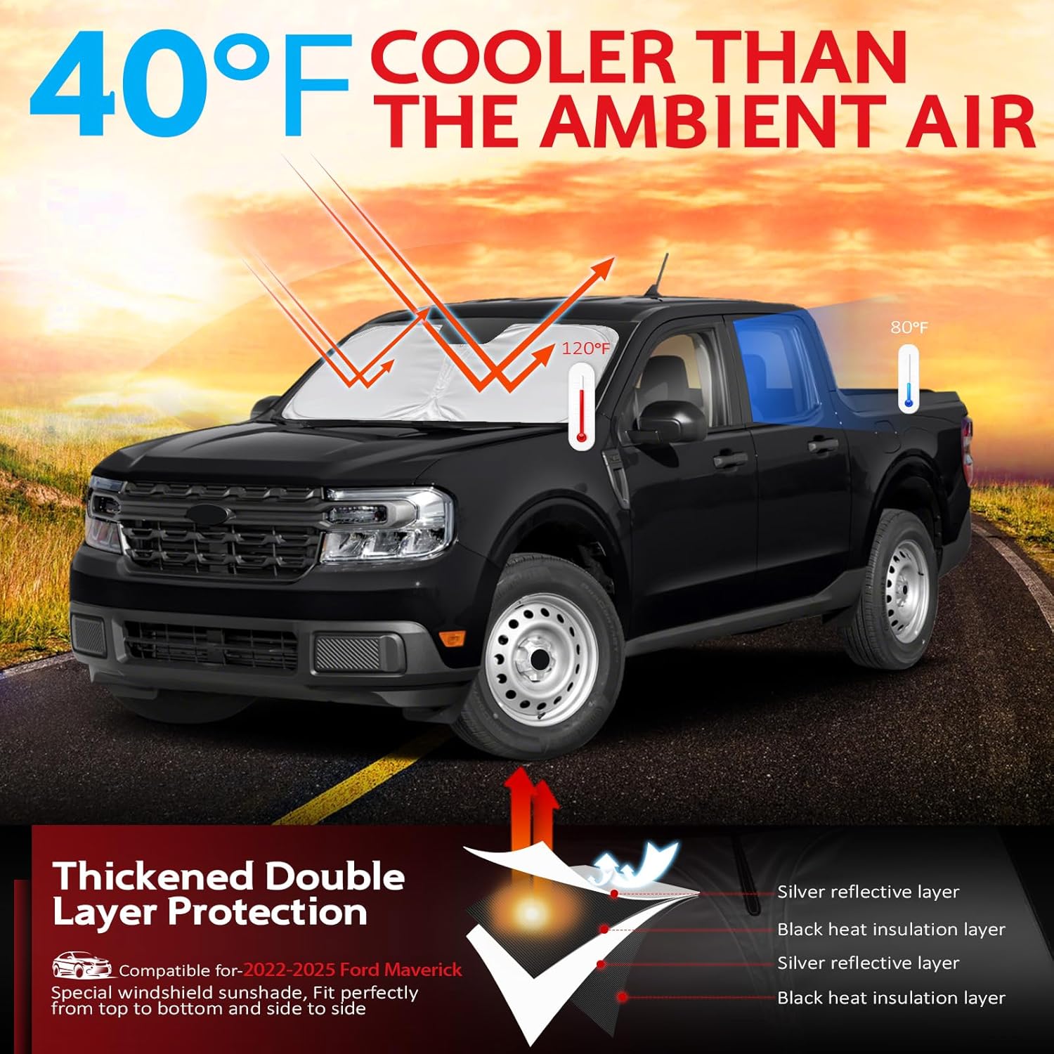 - KAYZT windshield sun shade is precise custom fit for 2022 2023 2024 2025 Ford Maverick, Thoroughly covers every corner of the windshield, Tailored to accommodate rear view mirror, Ensuring a seamless and snug fit without obstruction, Must have car accessories for Maverick