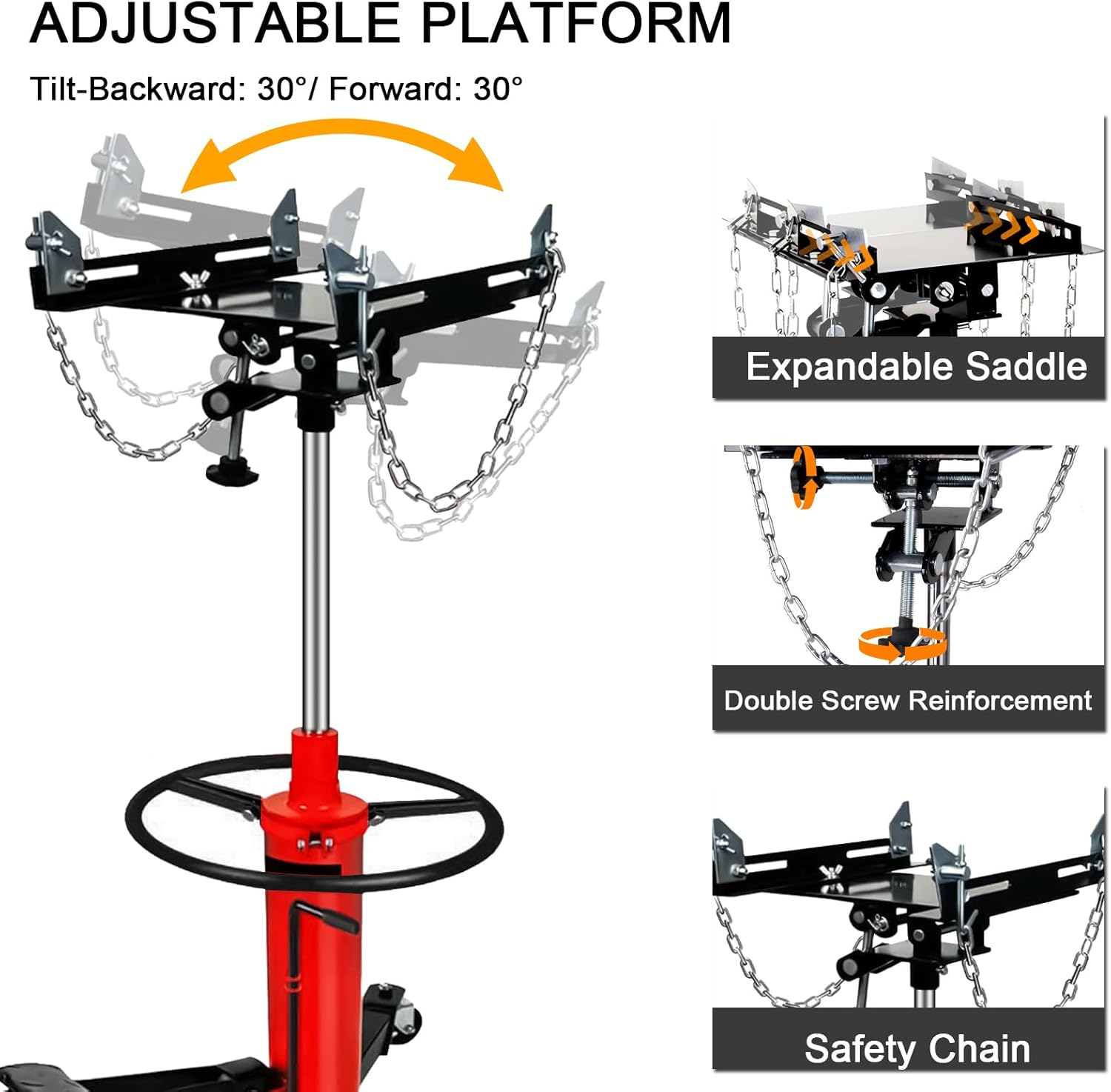 - Better control: Fully adjustable saddle with angle brackets, Long safety chains for securing the transmission to the saddle. Fits more transmissions. Foot pump allows the mechanic to position and align the transmission with both hands